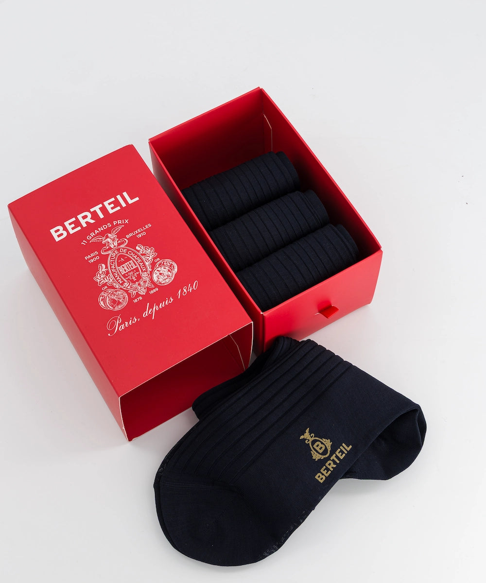 Article Malice Marine. Boîte de 4 chaussettes longues, douces et confortables. 100% coton, double fil d'Ecosse. Fabrication italienne. Tailles 11 (40-42), 11,5 (43-44) et 12 (45-46). Coloris : marine.
