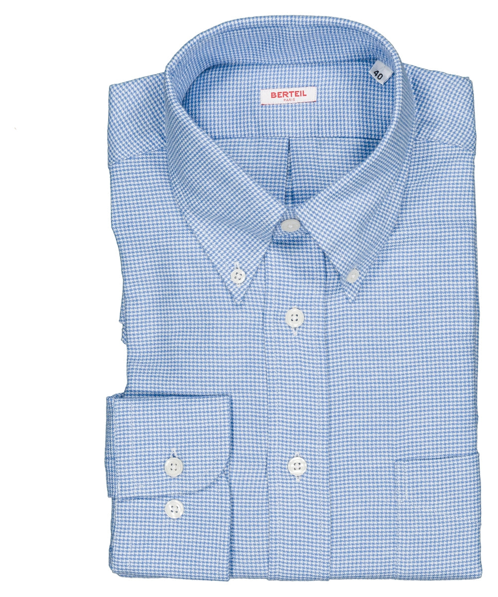 Modèle Alfred RB P. Chemise de forme classique avec col boutonné à manches longues et poignets simples. 100% coton premium. Tailles du 38 au 44. Coloris : pied de puce ciel.