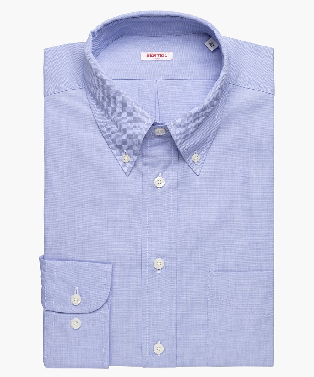 Chemise modèle Brook. Forme classique avec col boutonné à manches longues et poignets simples. 100% coton. Taille 38 au 44. Coloris : fil à fil bleu.