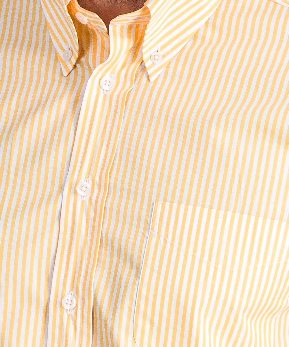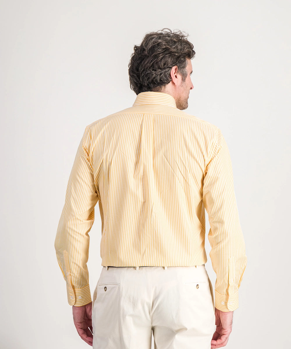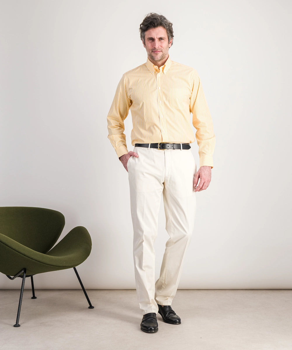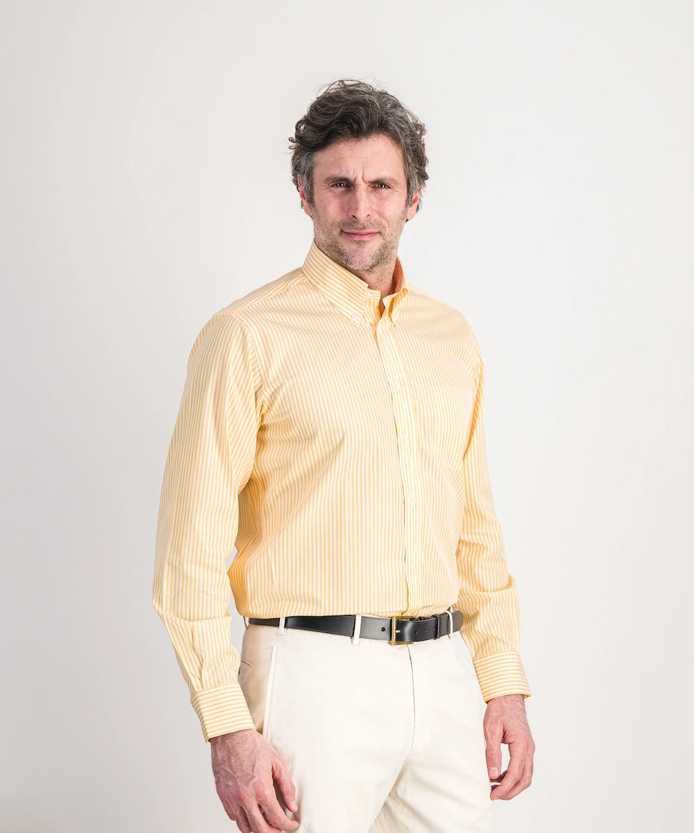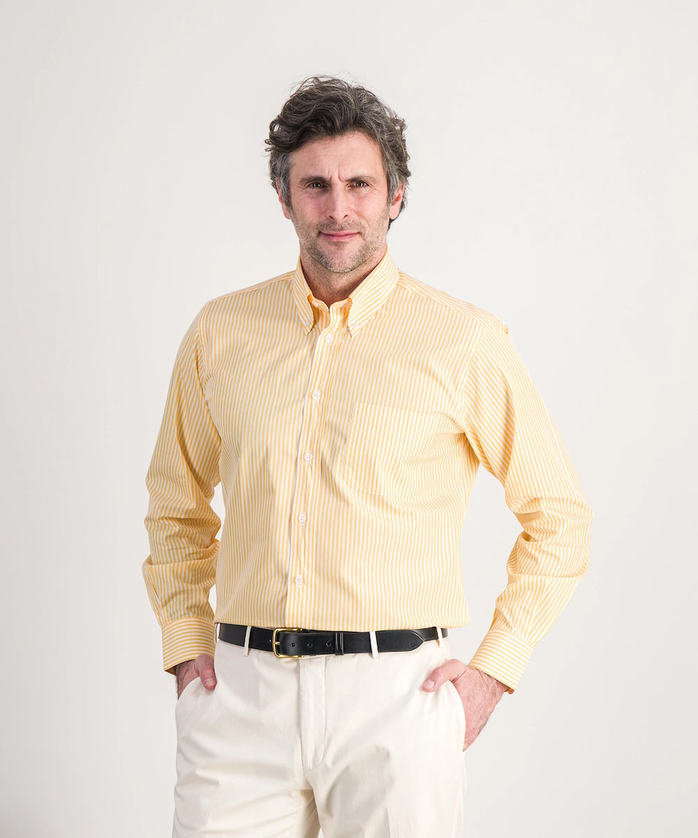 Modèle Alfred RB P. Chemise de forme classique avec col boutonné à manches longues et poignets simples. 100% coton premium. Taille 39 au 44. Coloris : rayure bâton soleil.