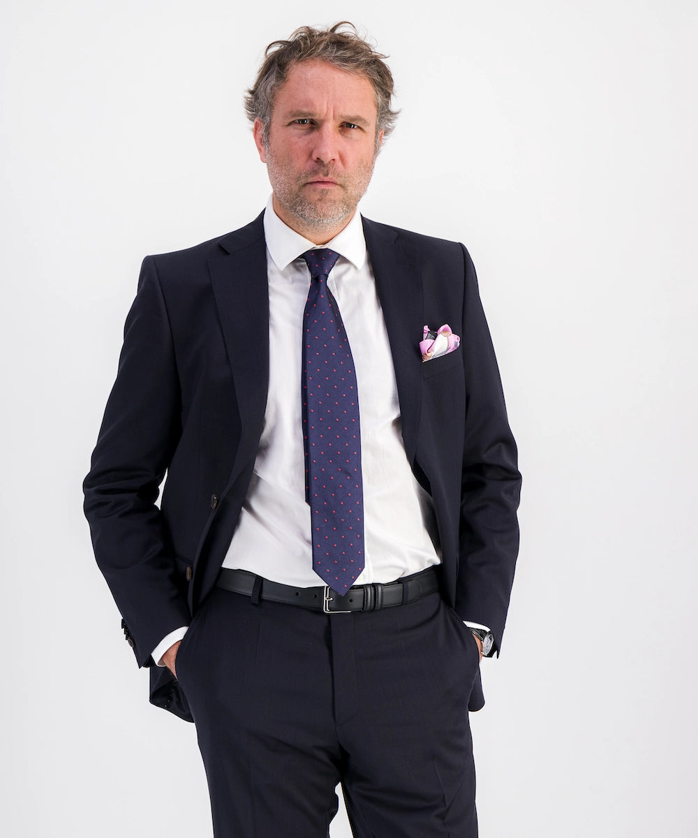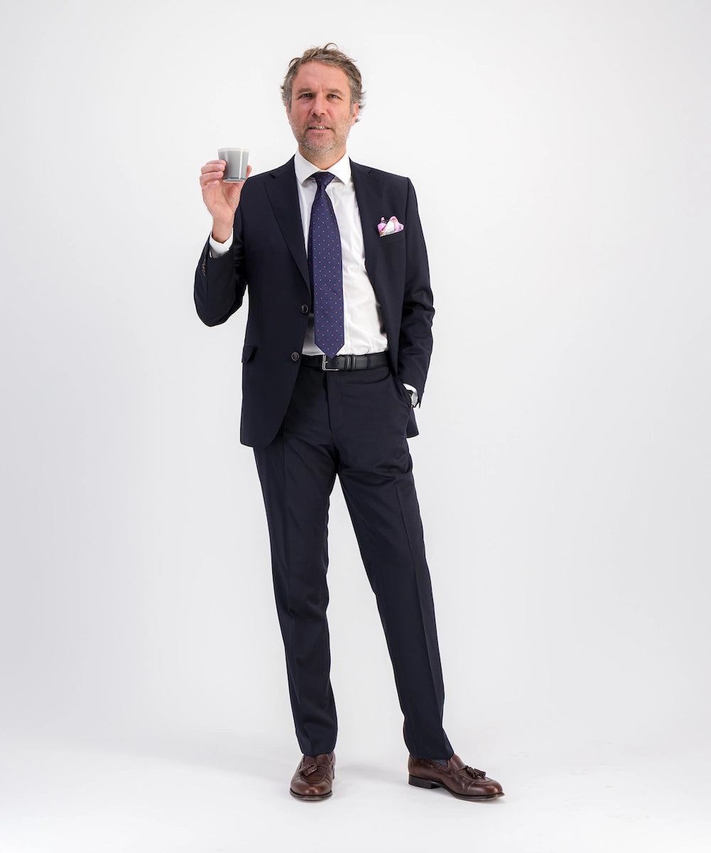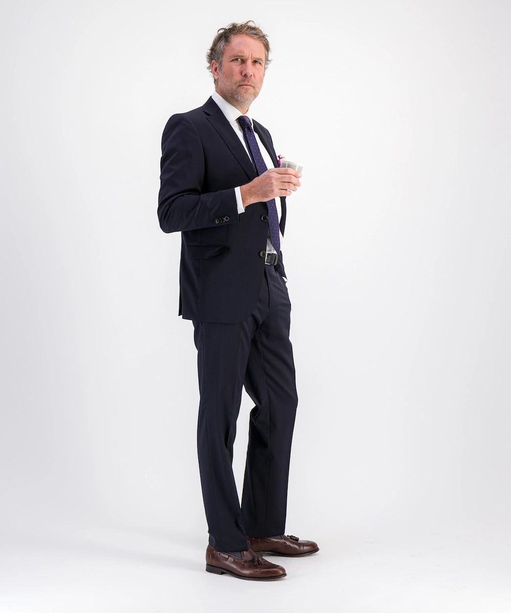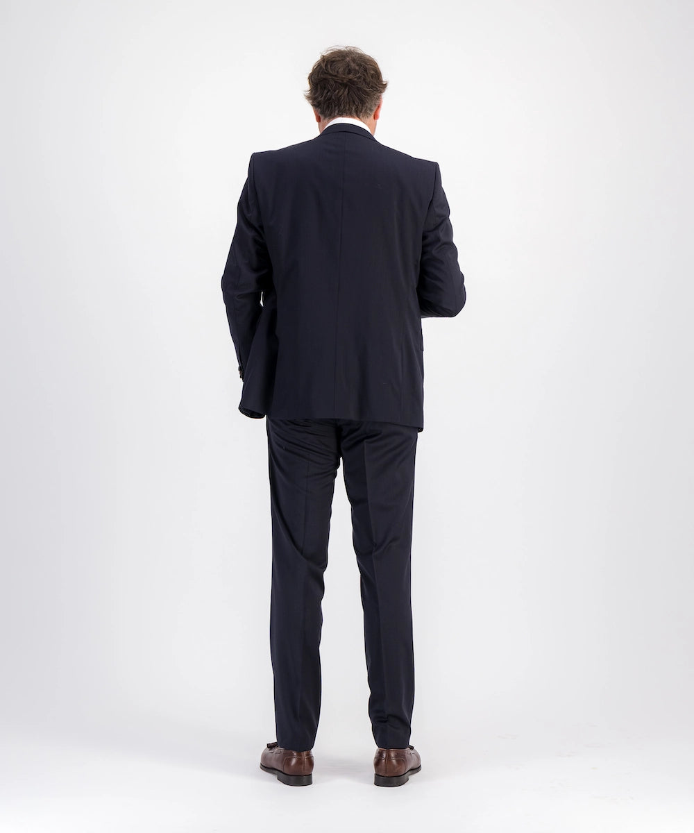 Modèle Saint Estèphe. Costume pour homme de coupe moderne sans pinces. Composé de 100% Laine 240 gr Cerutti. Tailles du 48 au 60. Disponible du 48 au 60. Coloris marine.