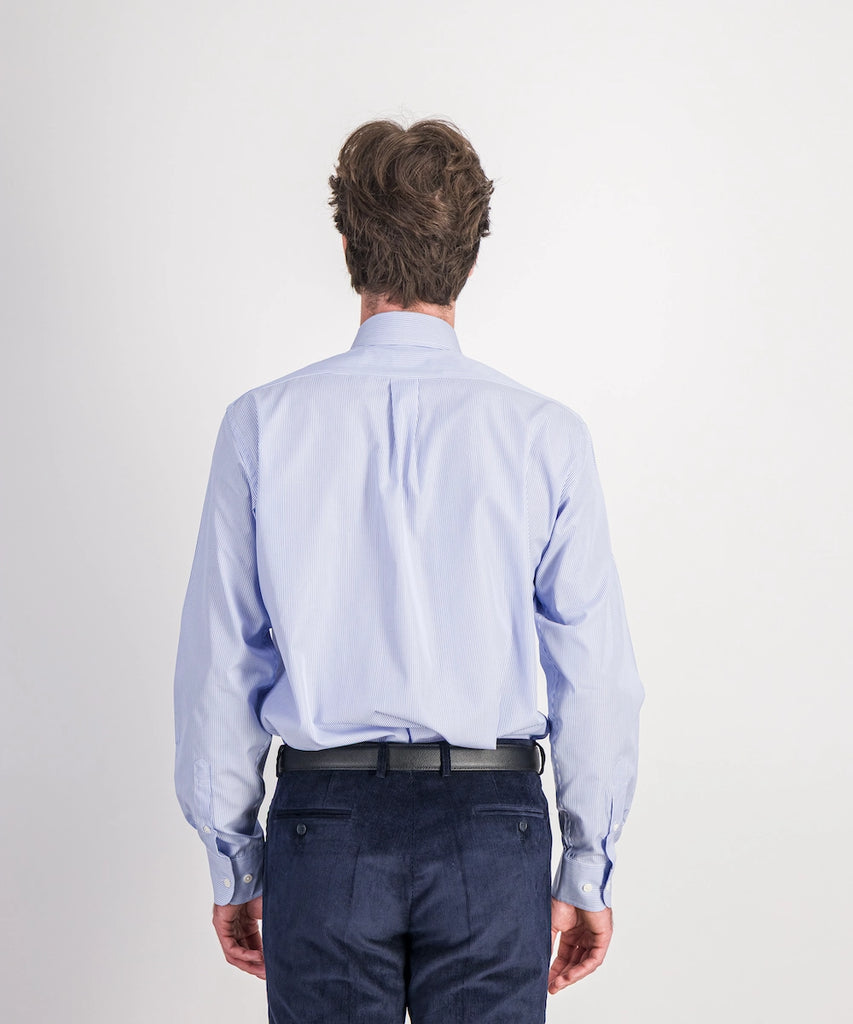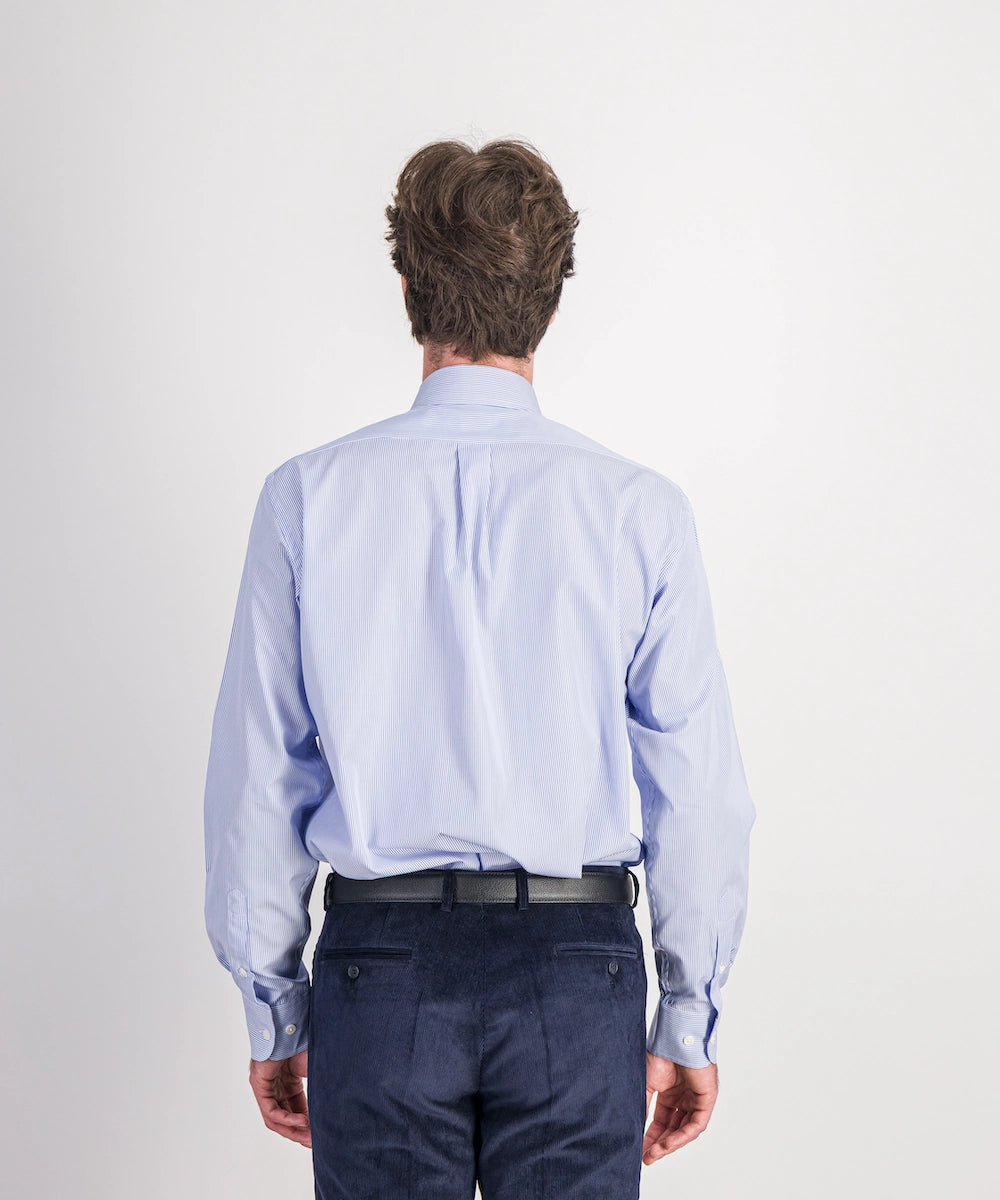 Chemise Alfred RB P. Forme classique avec col boutonné à manches longues et poignets simples. 100% coton premium. Tailles du 38 au 44. Coloris : rayure bleue