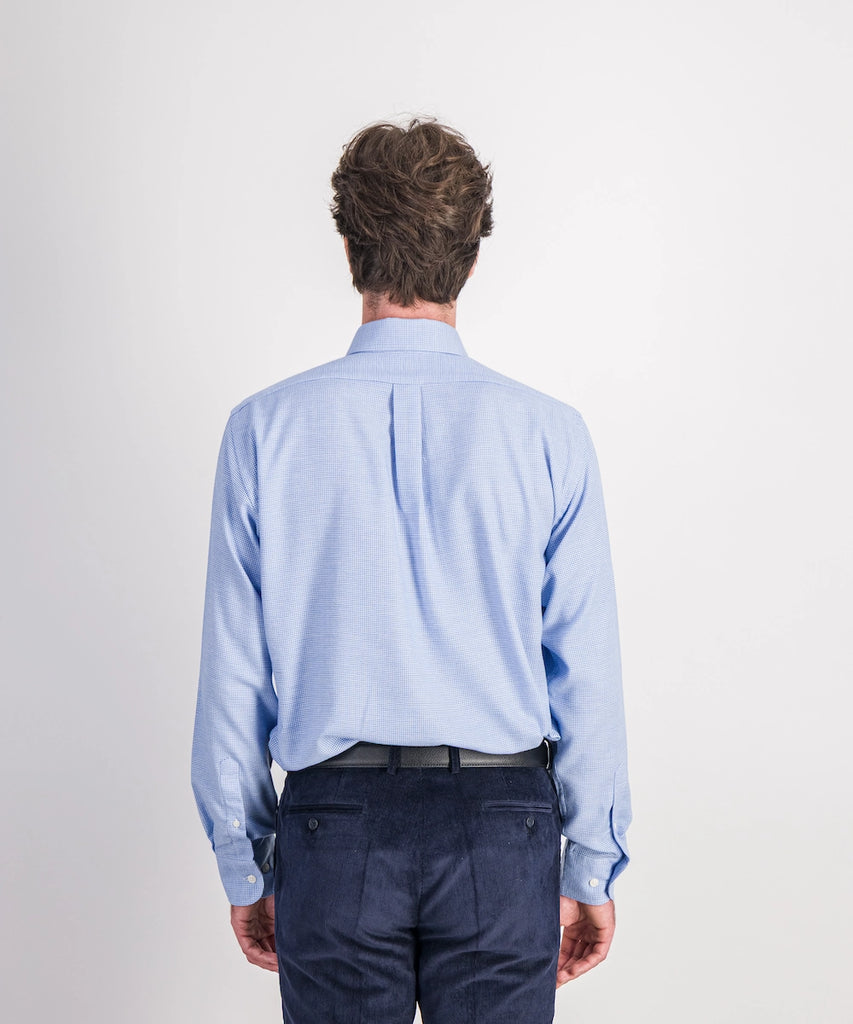 Modèle Alfred RB P. Chemise de forme classique avec col boutonné à manches longues et poignets simples. 100% coton premium. Tailles du 38 au 44. Coloris : pied de puce ciel.