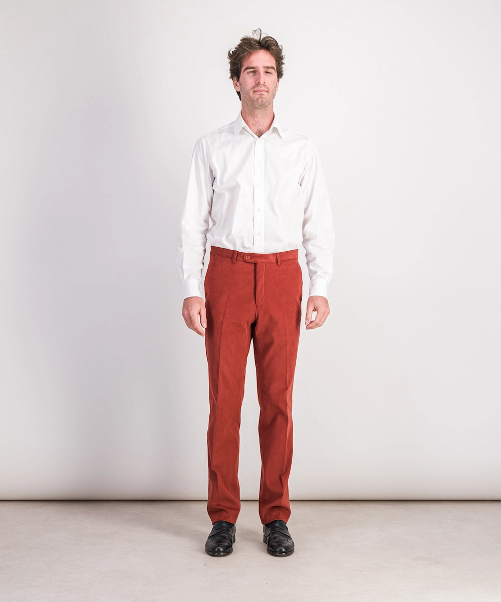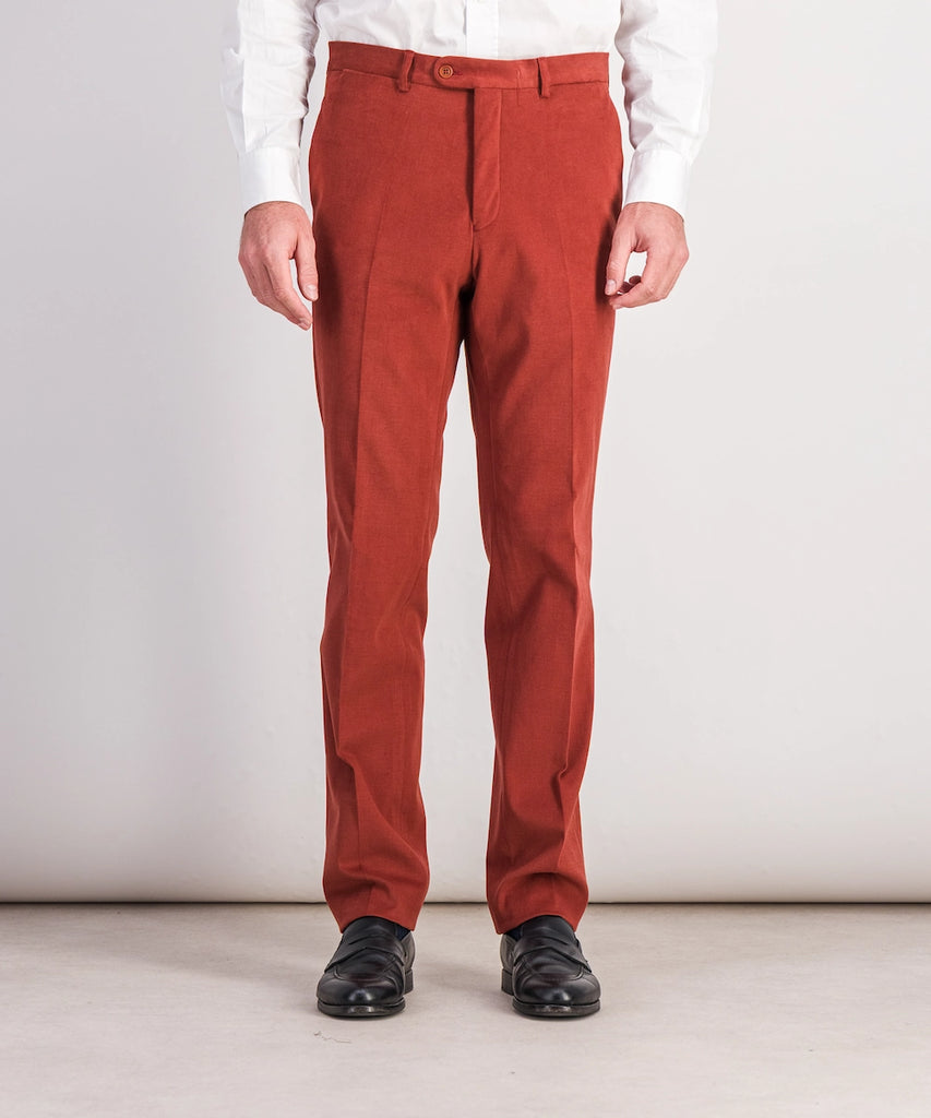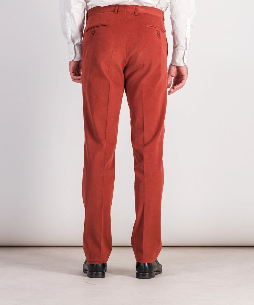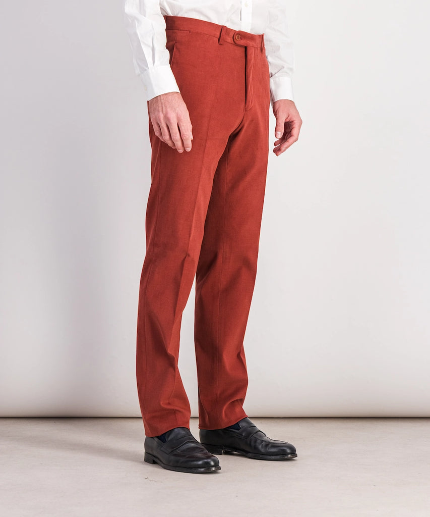Modèle Cardidd. Pantalon décontracté de coupe moderne sans pinces en gros coton. 98% coton Sondrio 430 g, 2% élasthanne. Taille du 42 au 54. Coloris : brique.