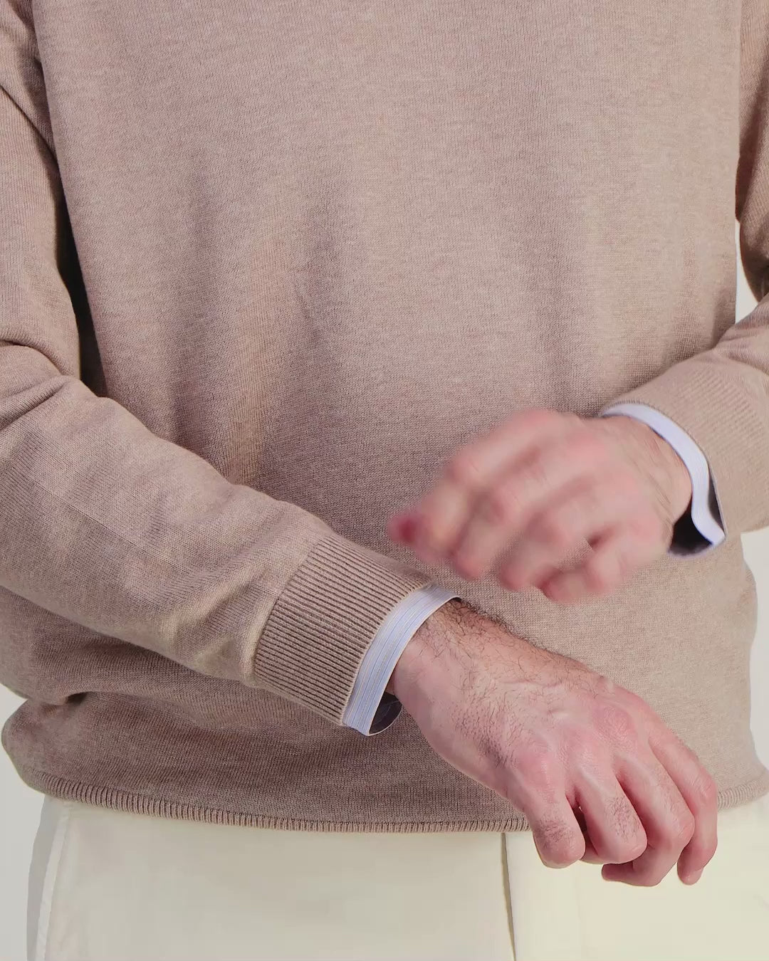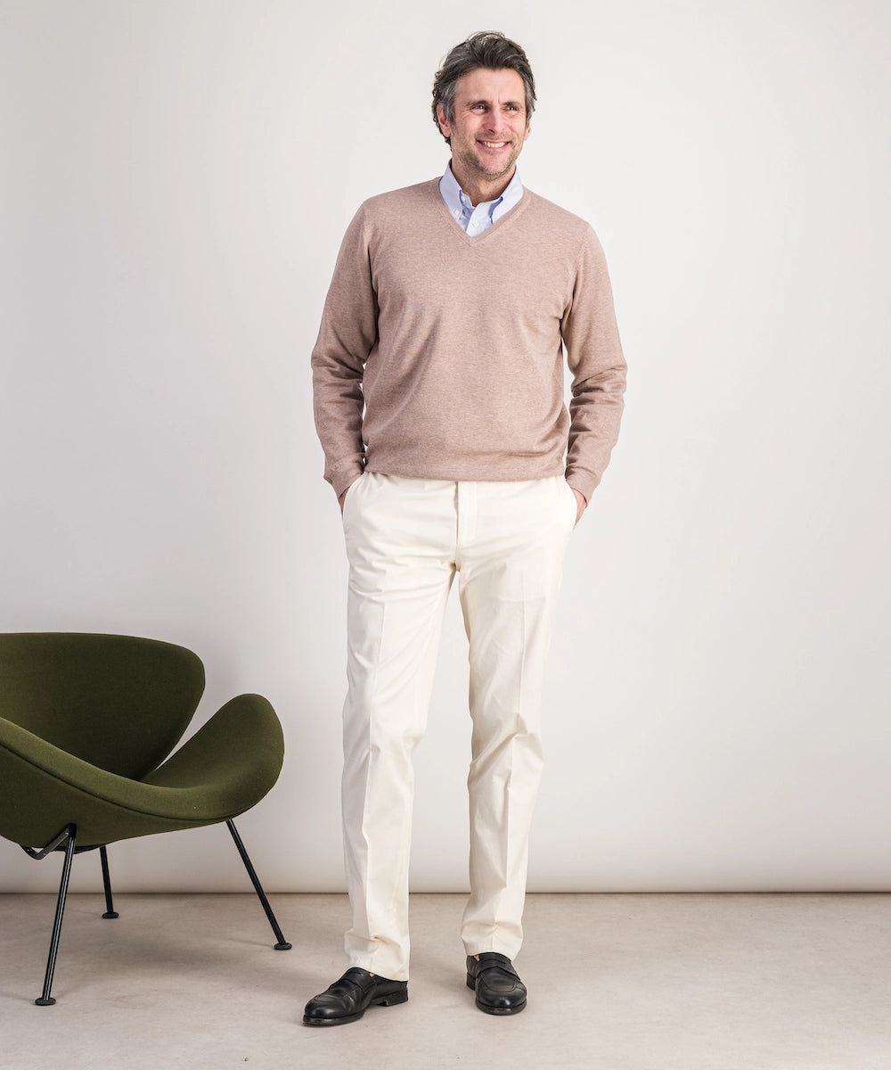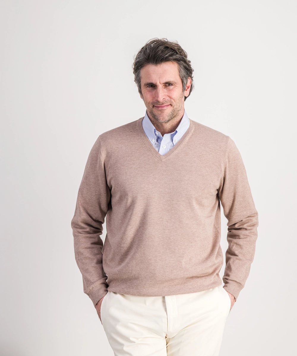 Modèle Régate V. Pull à col V. Composé de 92% coton, 8% cachemire. Disponible du 42 au 48. Coloris : coffee.