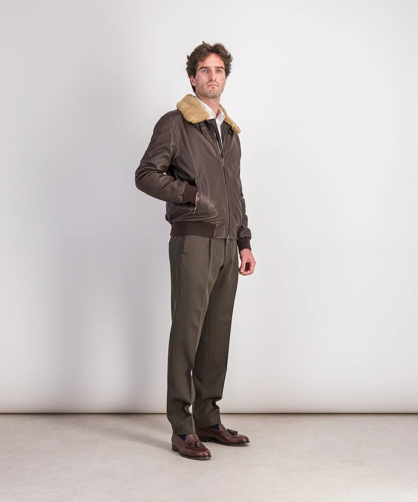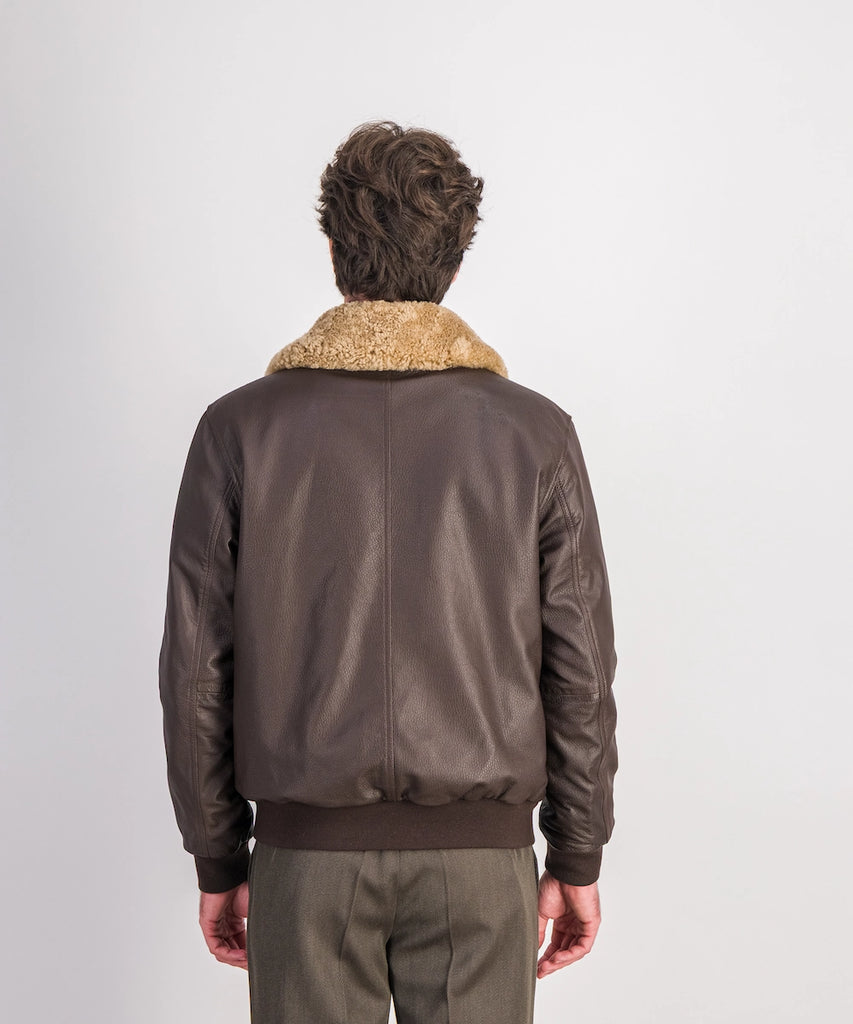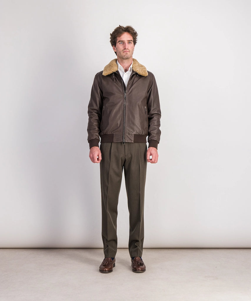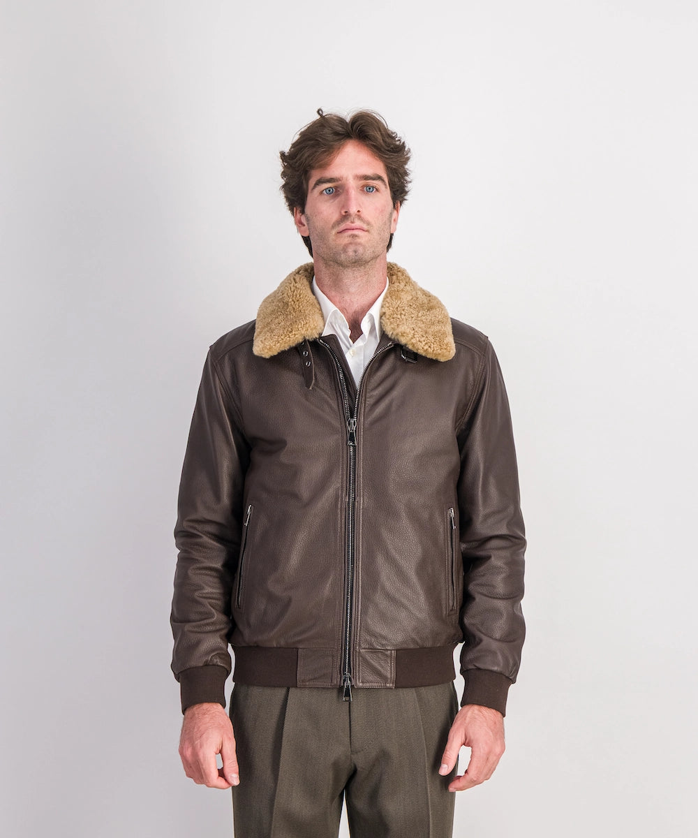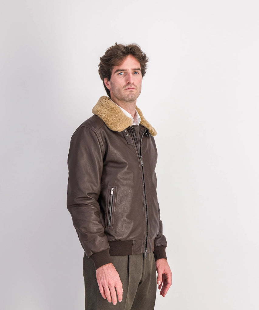 Modèle Aviateur. Blouson classique en peau. Composition : 100% agneau. Taille du 50 au 54. Coloris : brun.