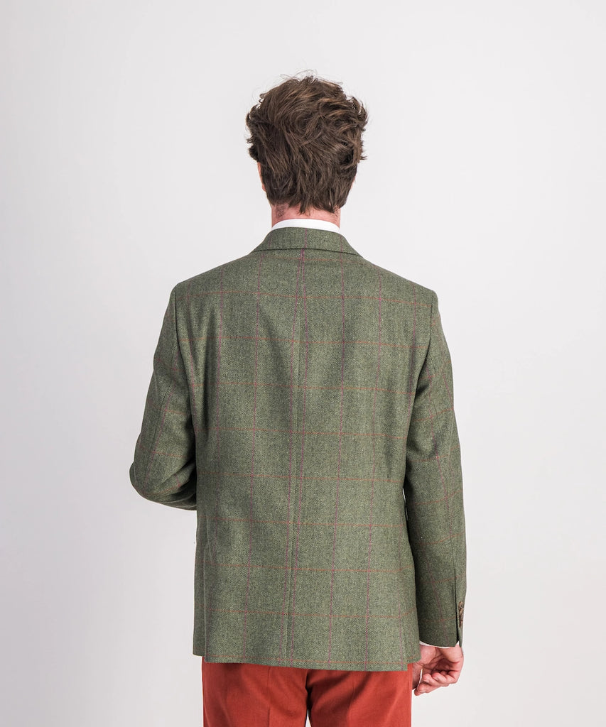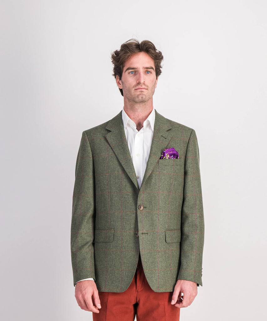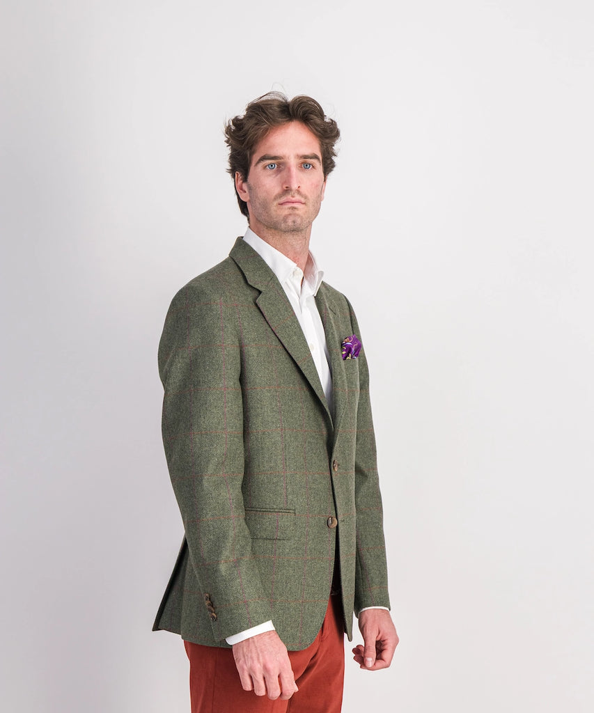 Modèle Killarney. Veste sport pour le week-end. Composée 100% lambswool 320 g. Taille 50 au 60. Coloris : carreau rose rouge sur chevrons verts.
