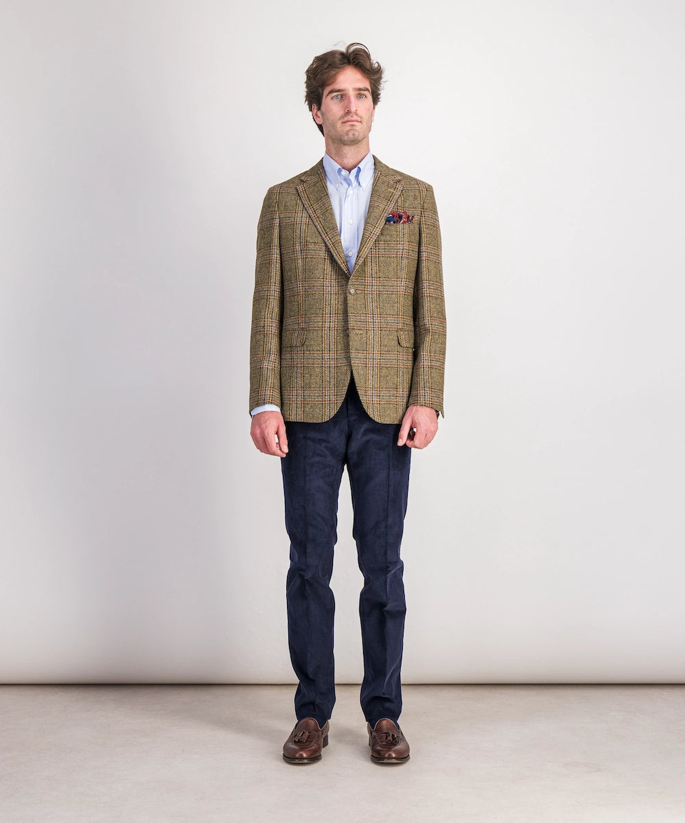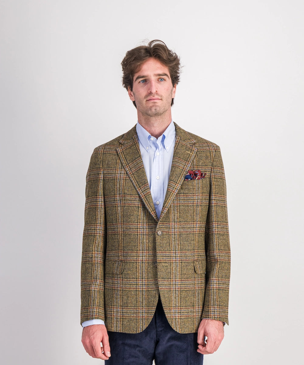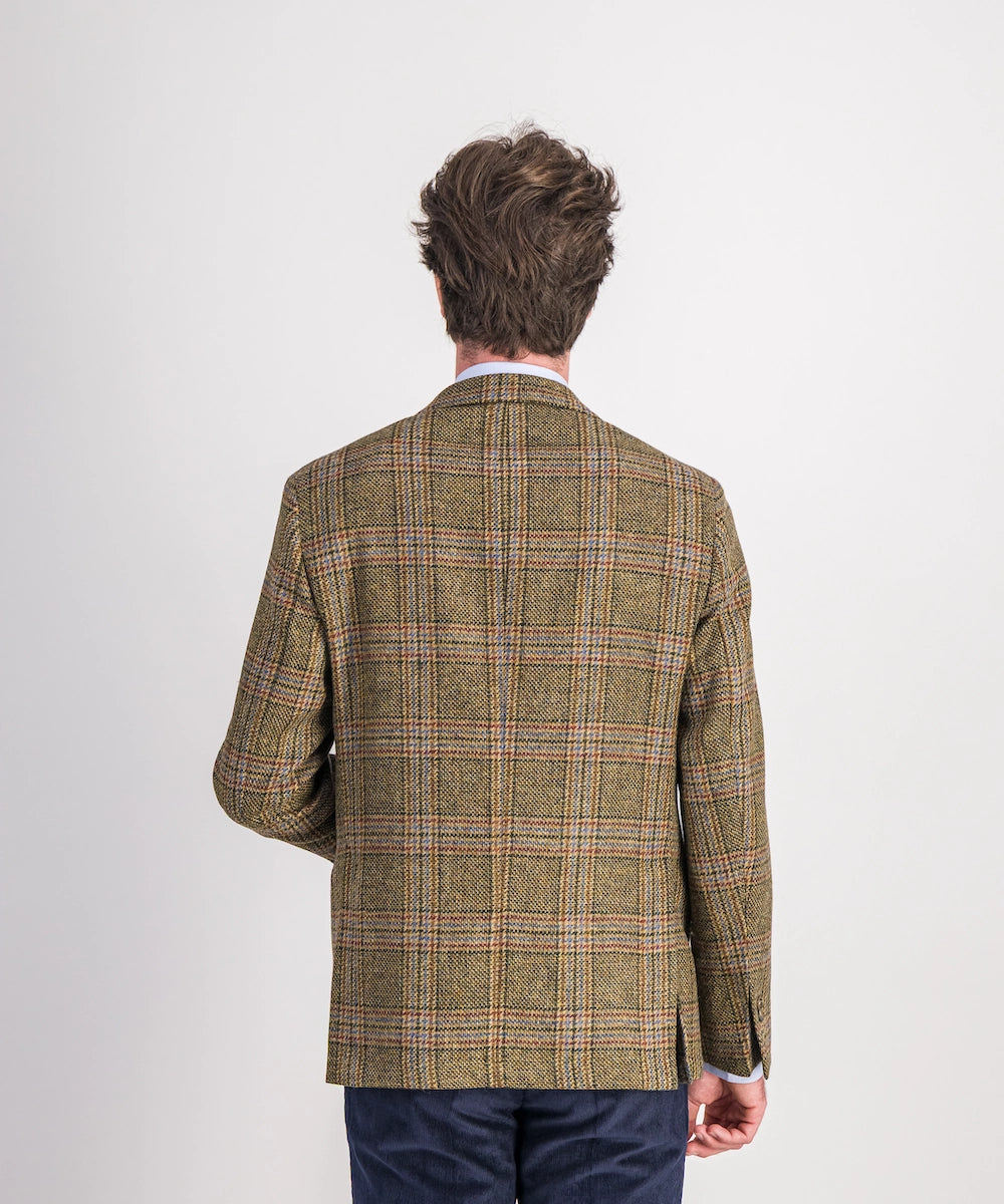 Modèle Prusse. Veste destructurée demi-doublée avec des poches à rabat. Composée de 100% laine 340 g. Tailles du 52 au 58. Motif : carreau multicolore.
