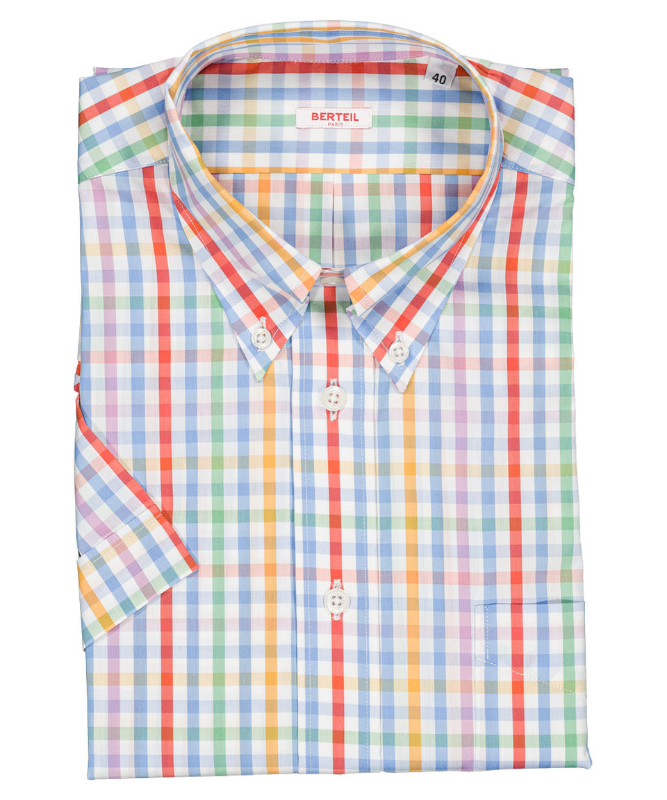 Modèle Alfred RC. Chemise à col boutonné et manches courtes, boutons simili nacre. 100 % coton. Tailles du 40 au 43. Coloris : carreau multicolore.