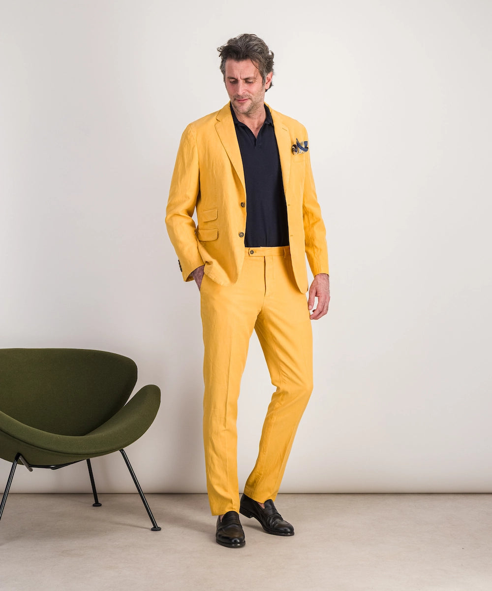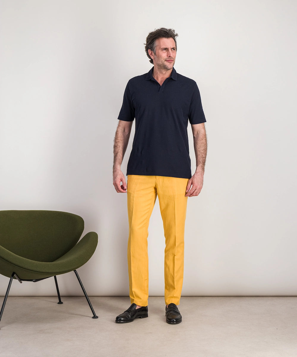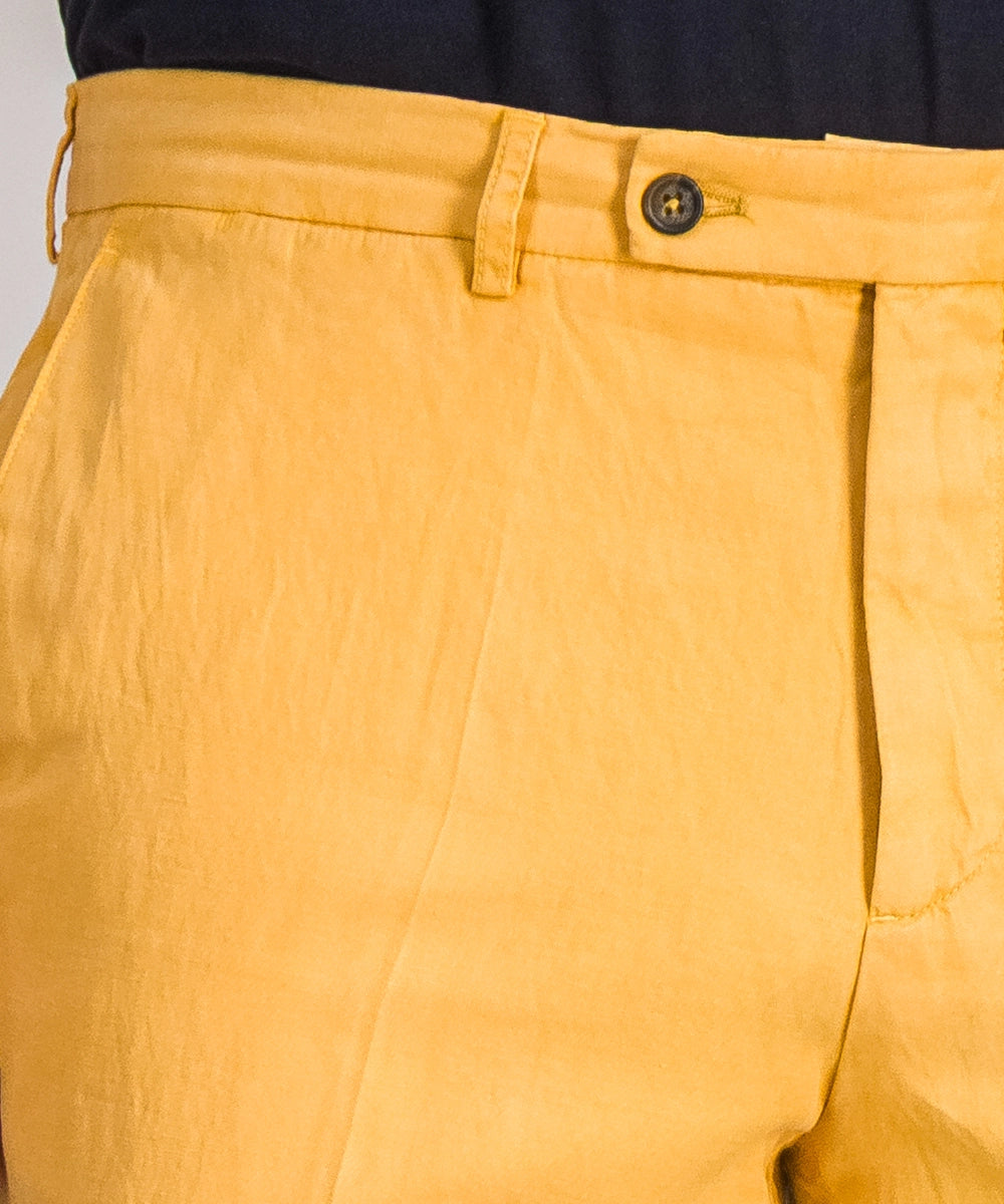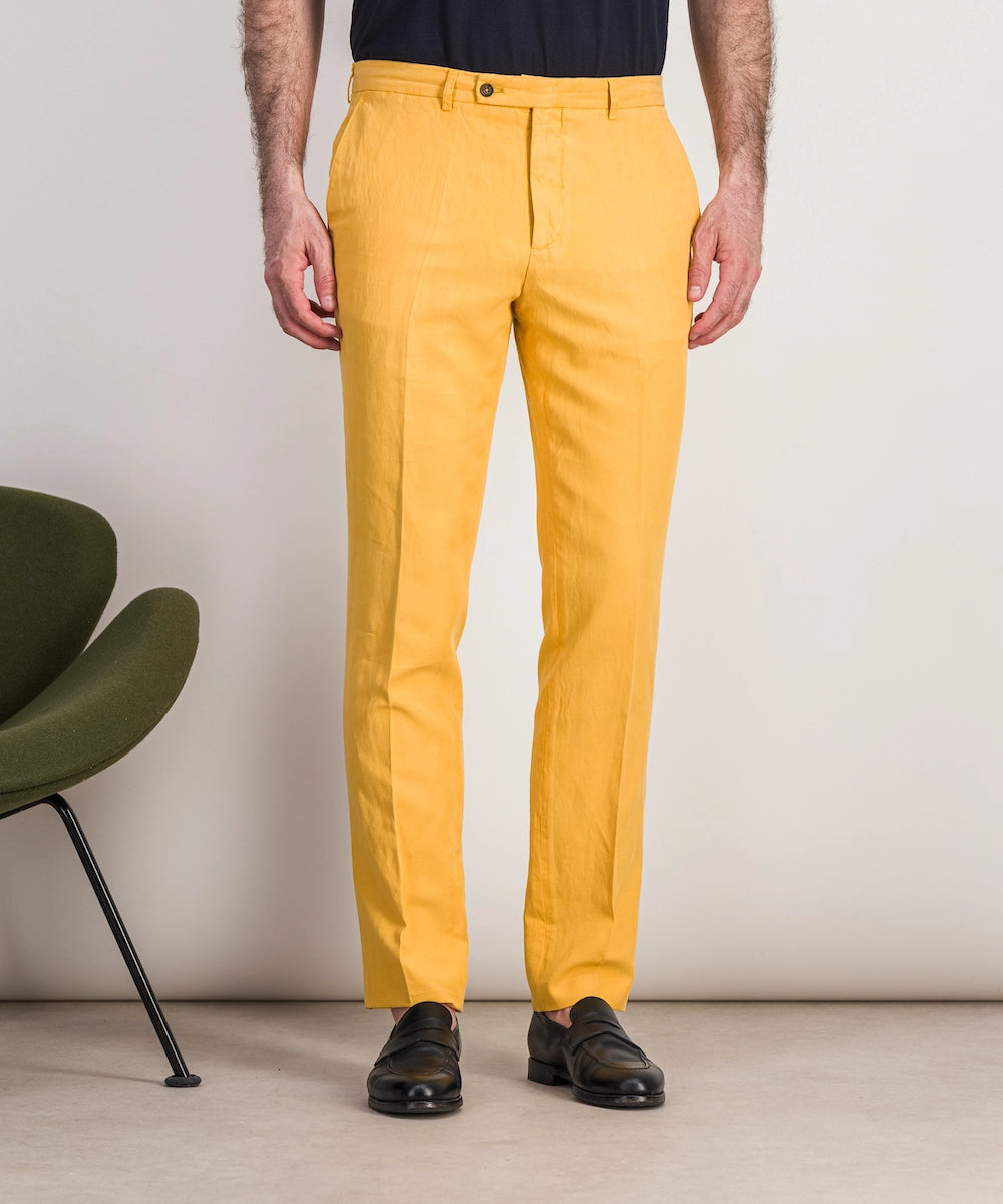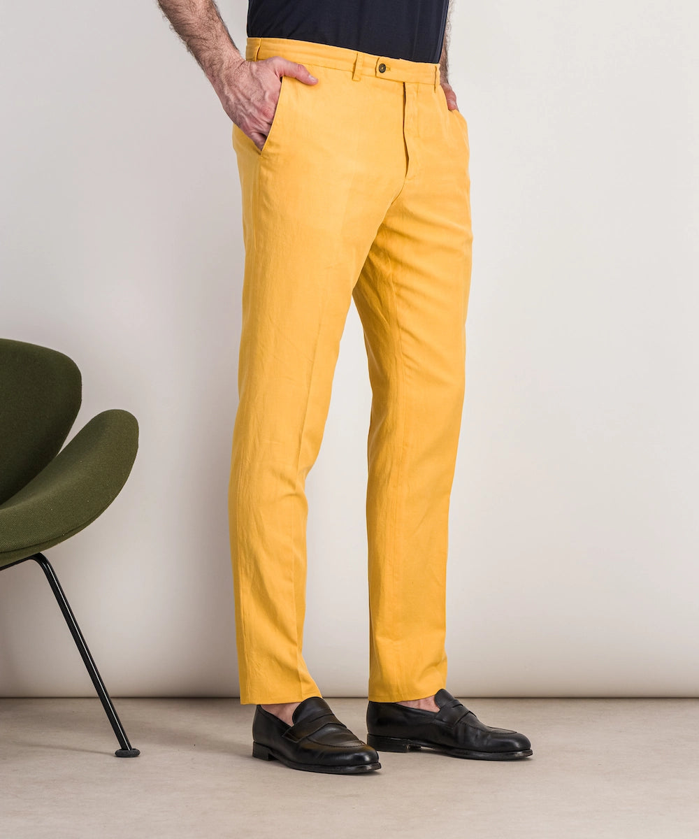 Pantalon décontracté en toile de coupe moderne, sans pinces. 59% lyocell, 23% lin, 18% coton. Tailles du 44 au 52. Coloris : jaune.