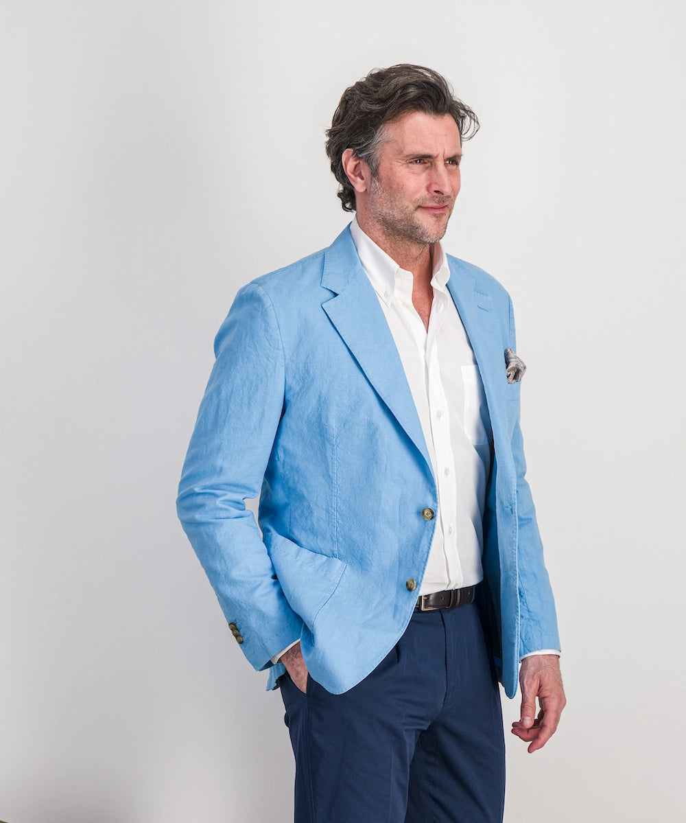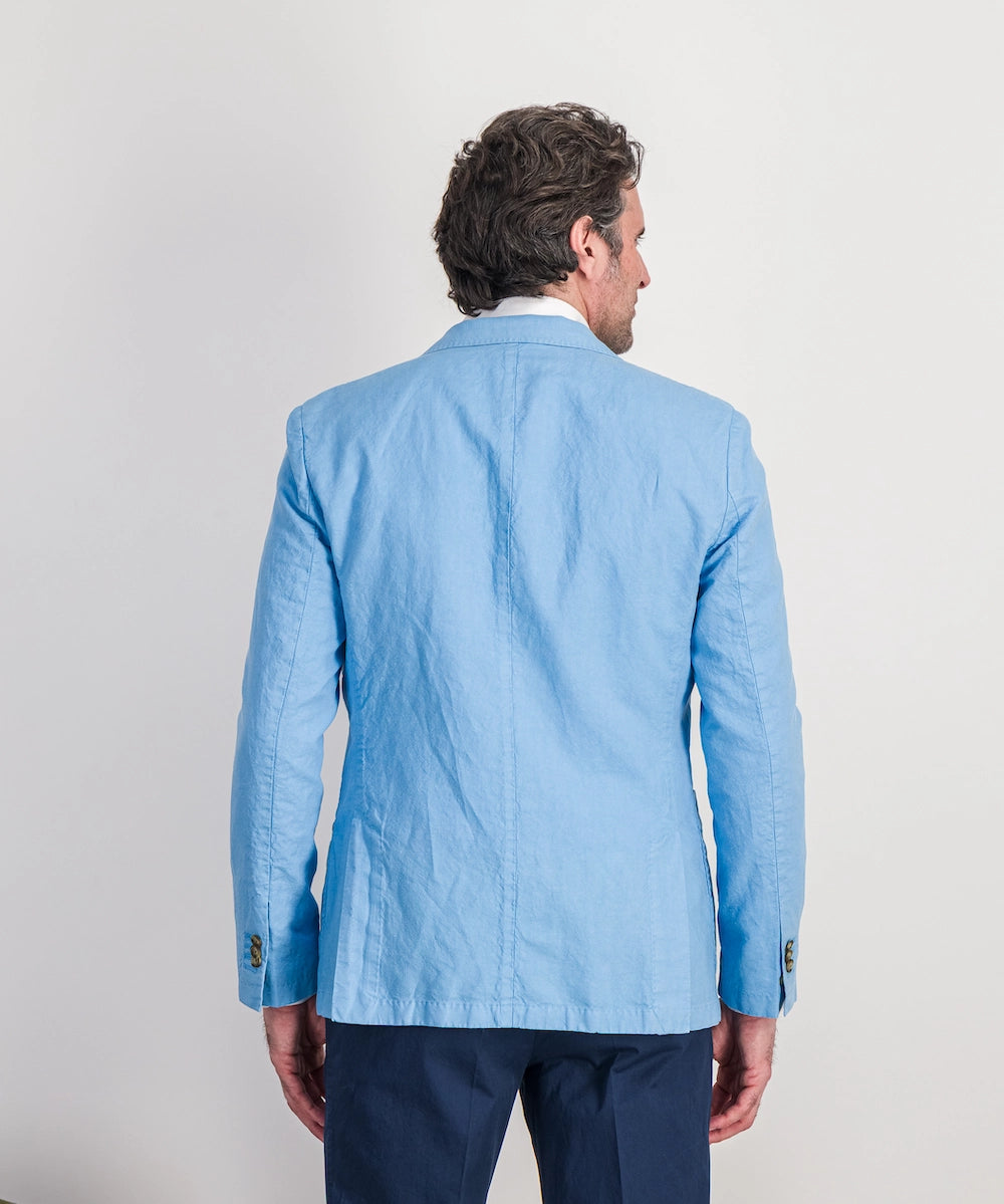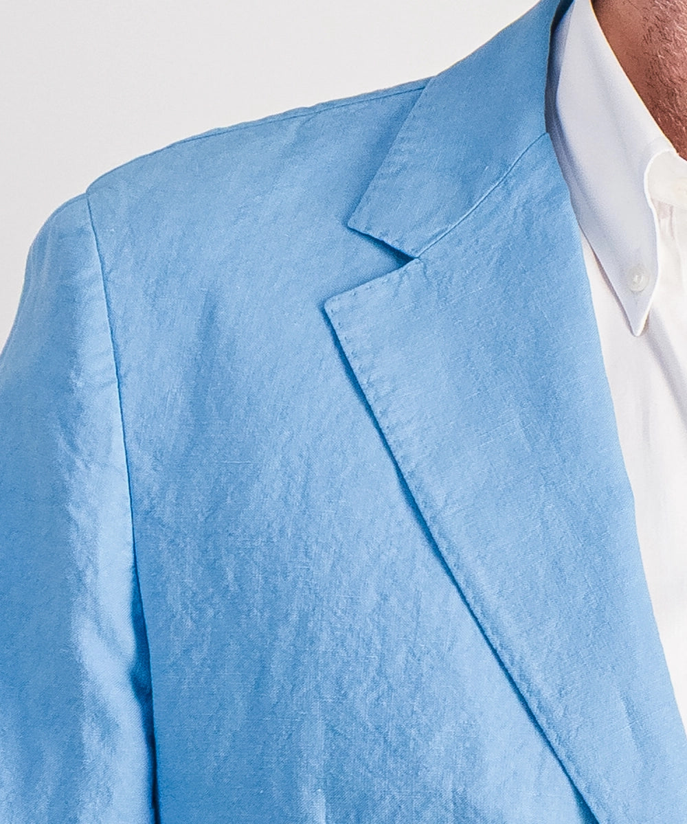 Modèle Positano. Veste non doublée, déstructurée de coupe classique. Composée de 51% lin, 49% coton (310)g. Tailles 52 au 54. Coloris : turquoise.