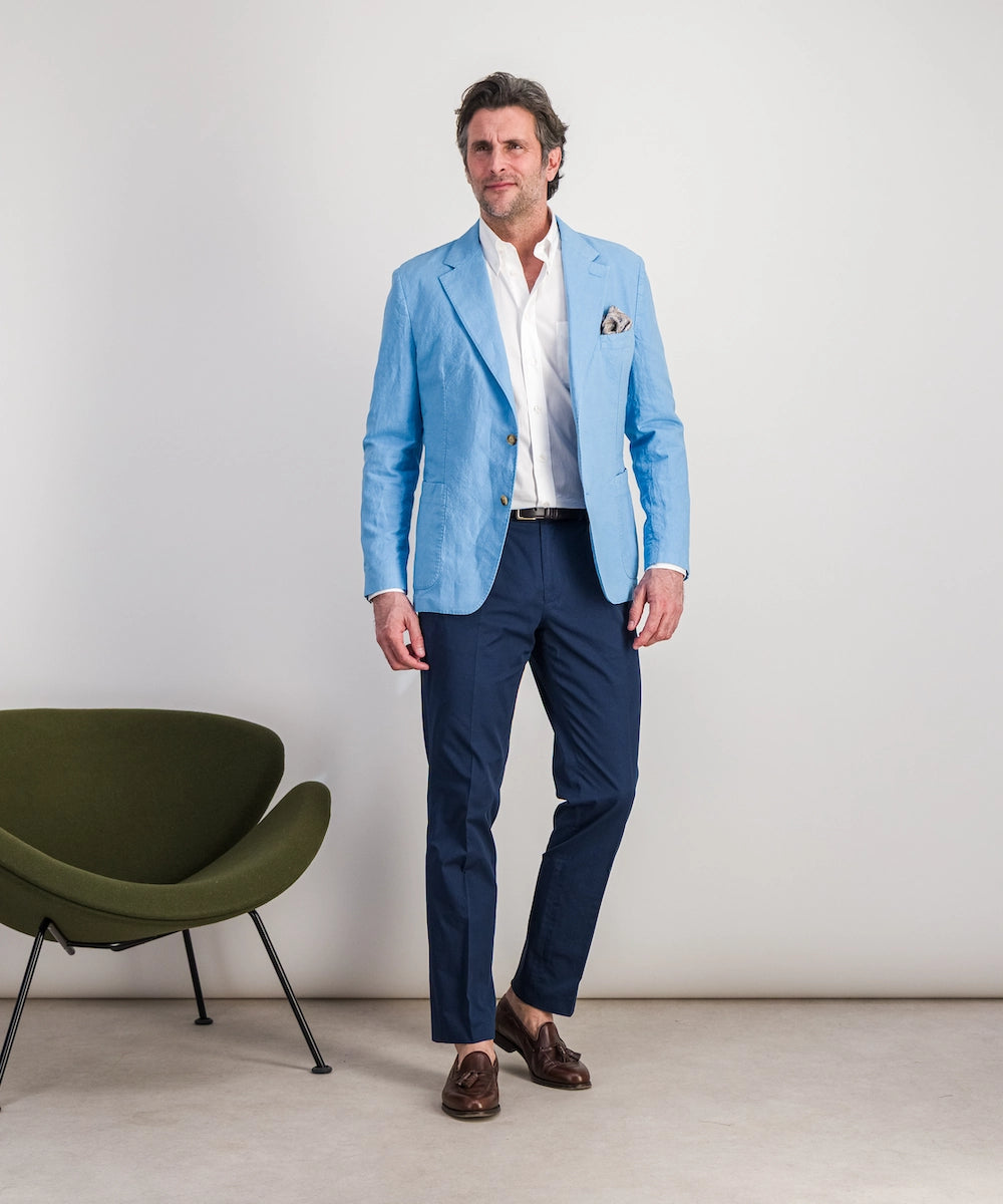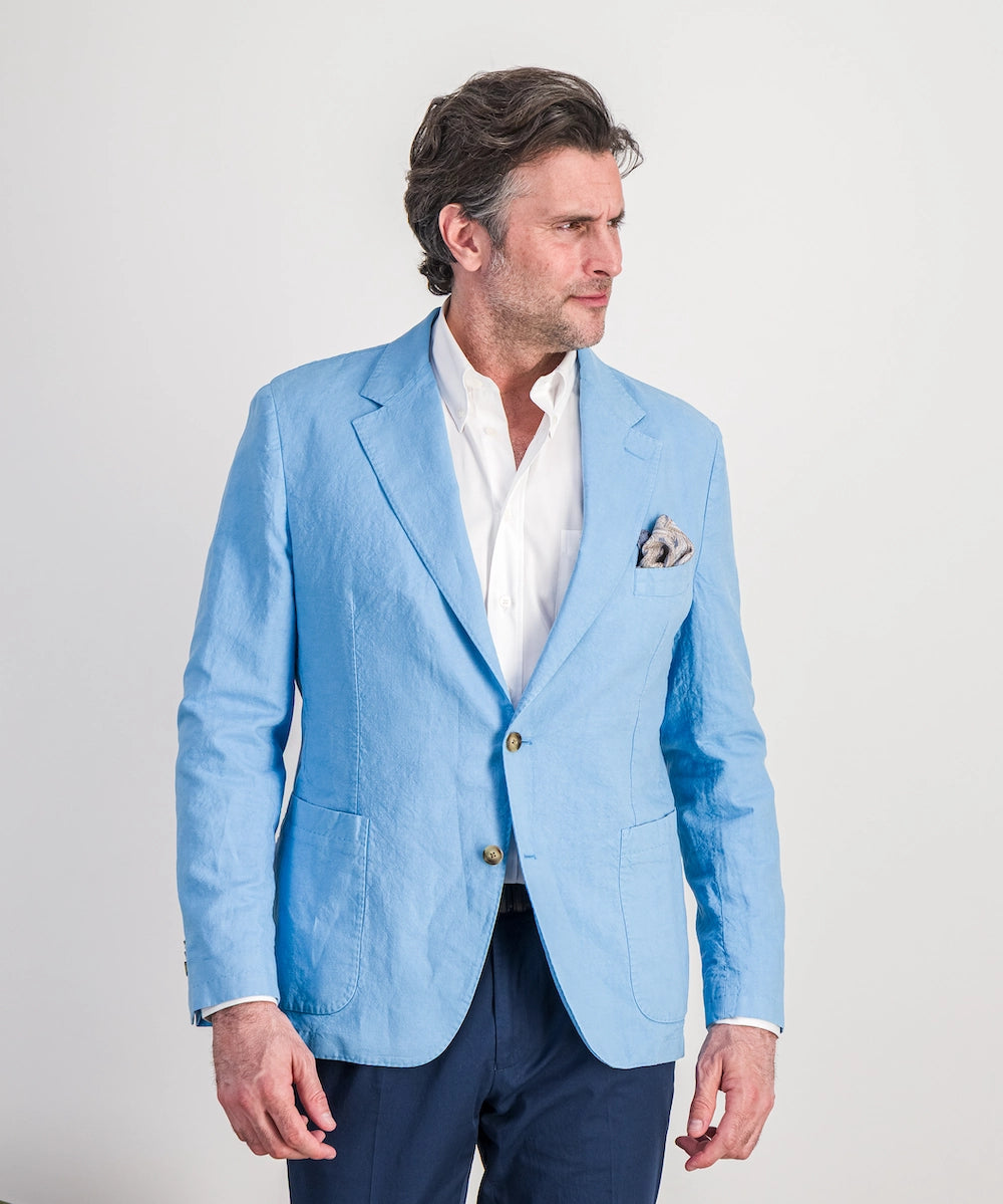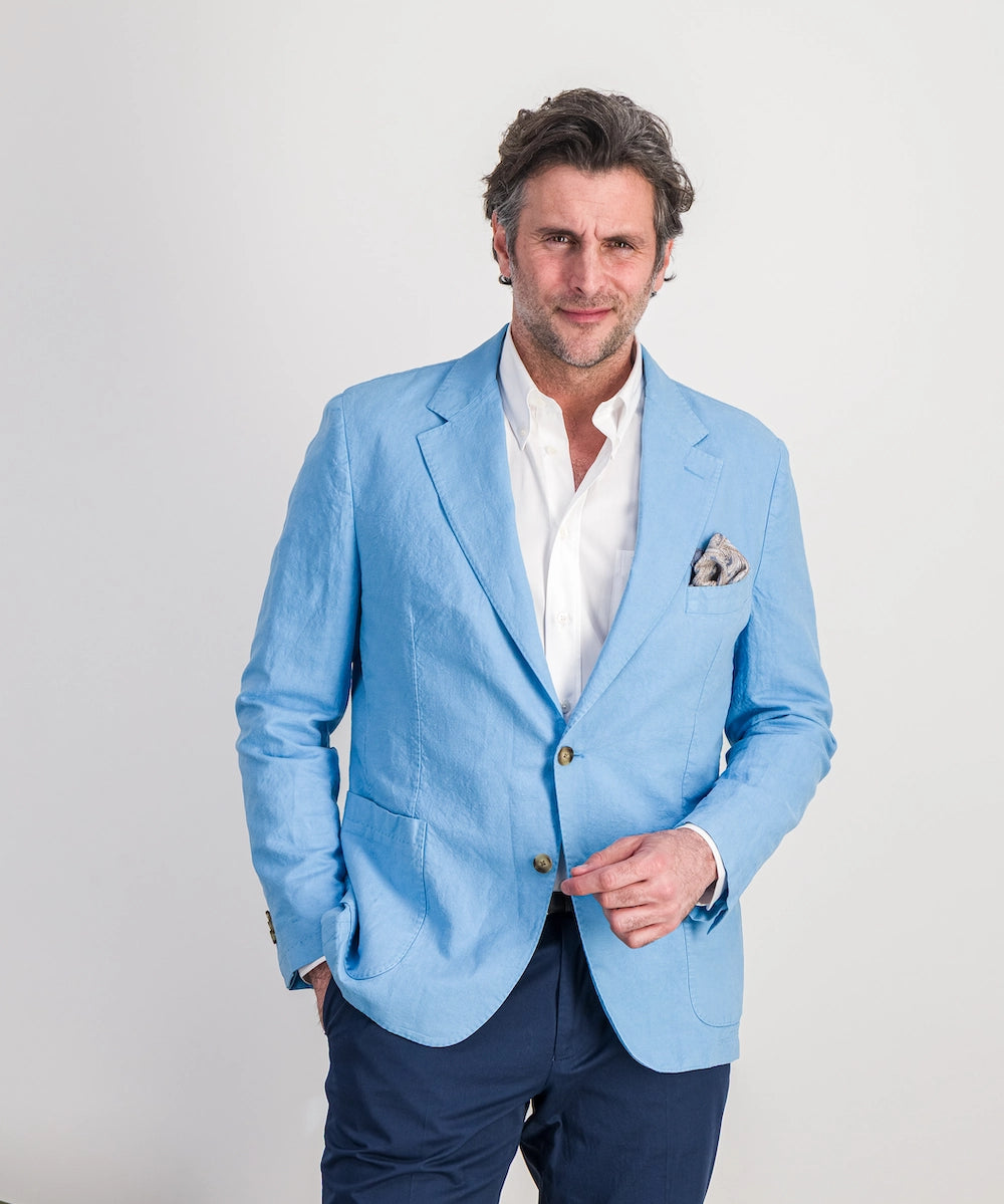 Modèle Positano. Veste non doublée, déstructurée de coupe classique. Composée de 51% lin, 49% coton (310)g. Tailles 52 au 54. Coloris : turquoise.