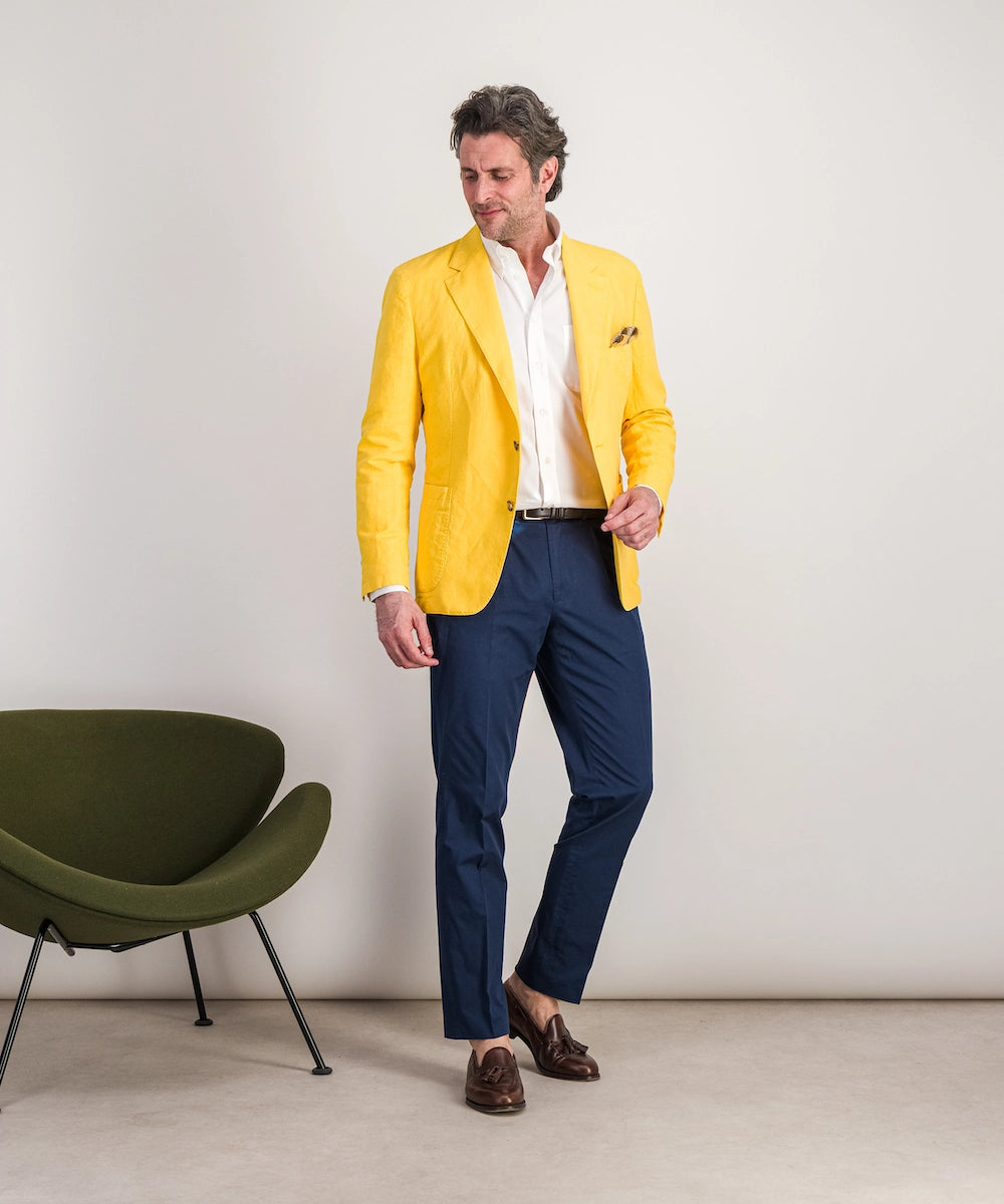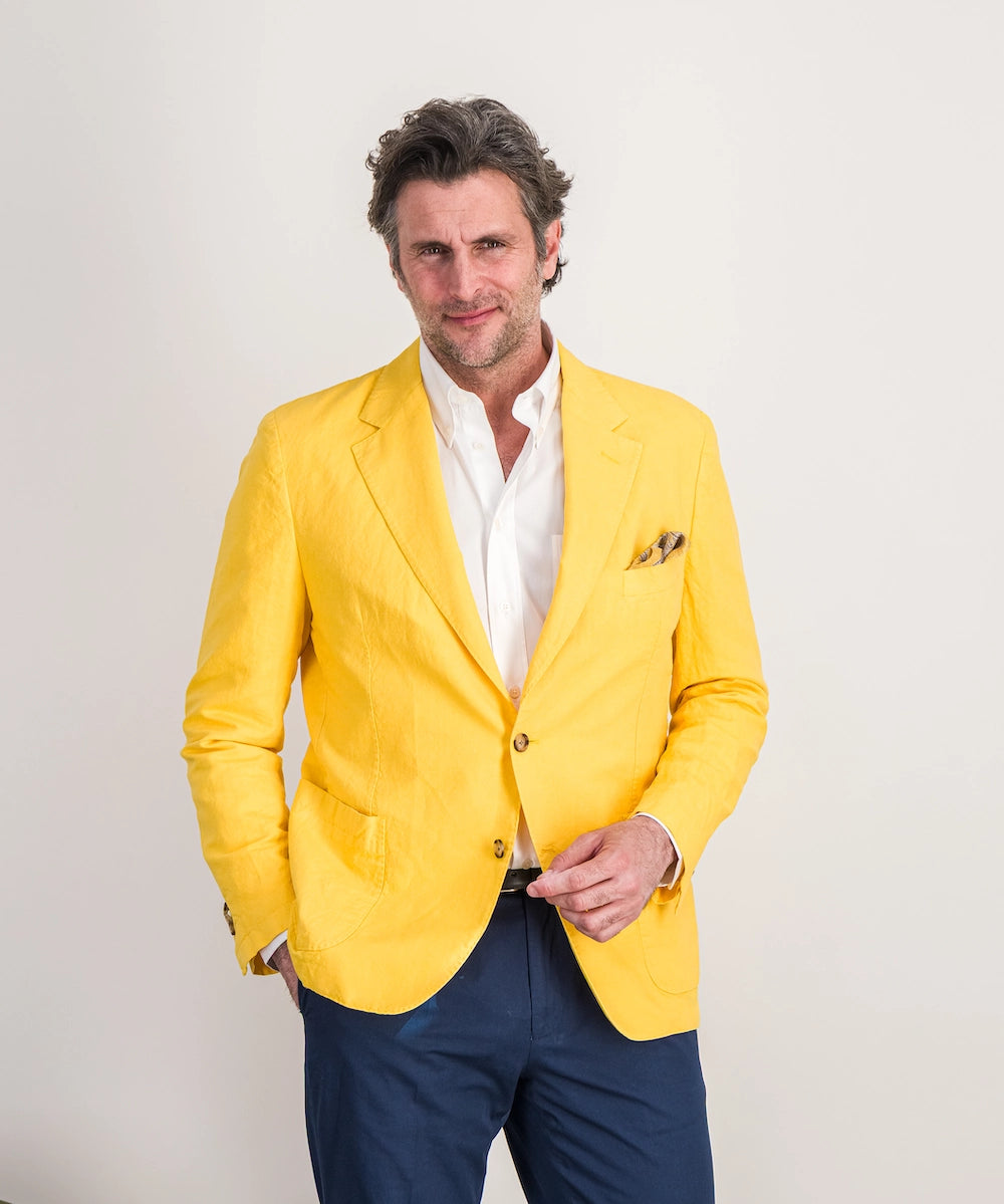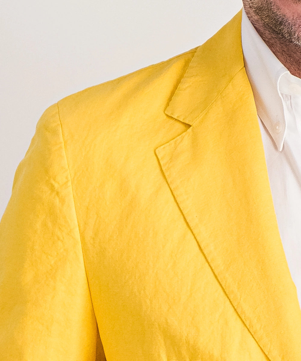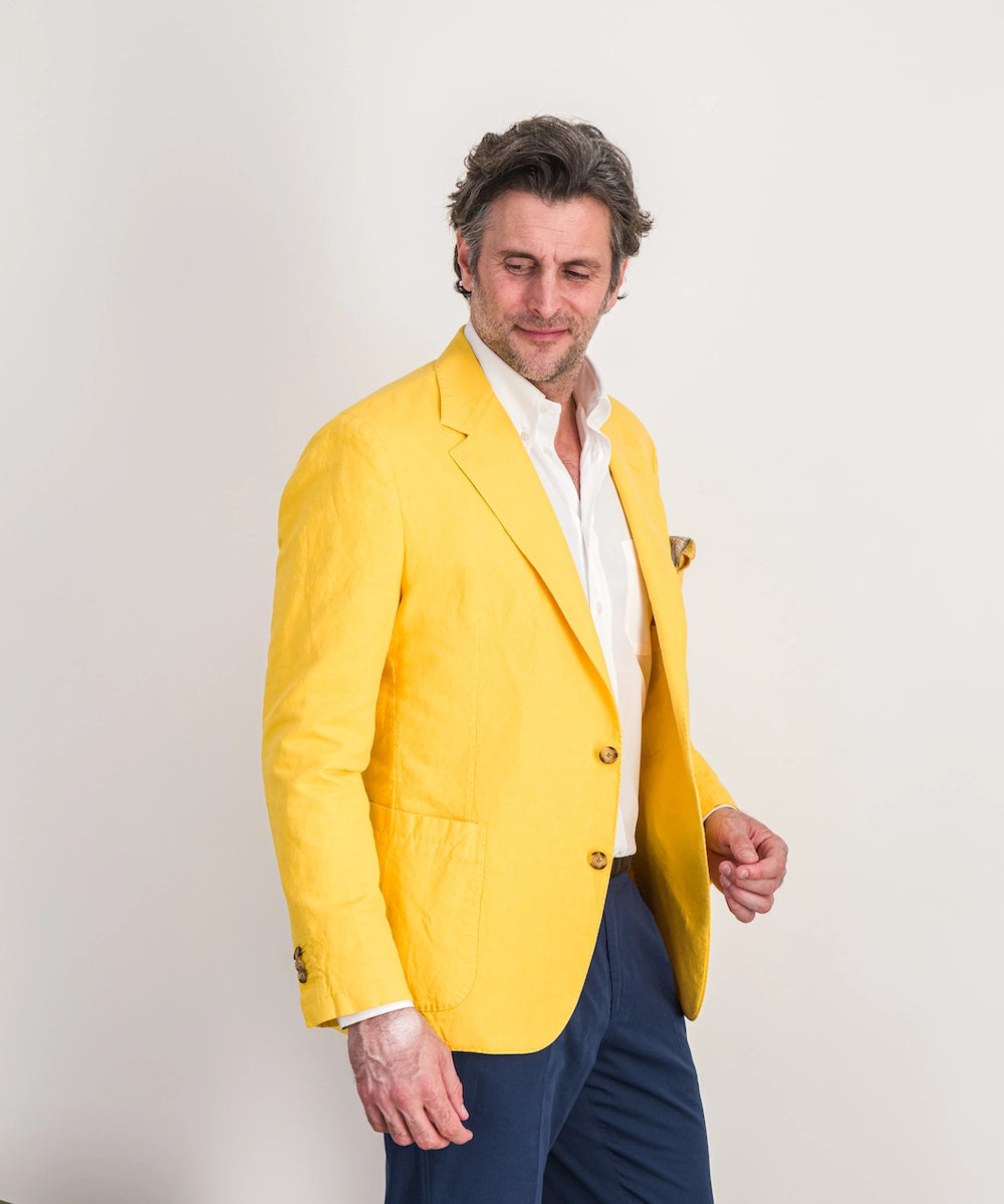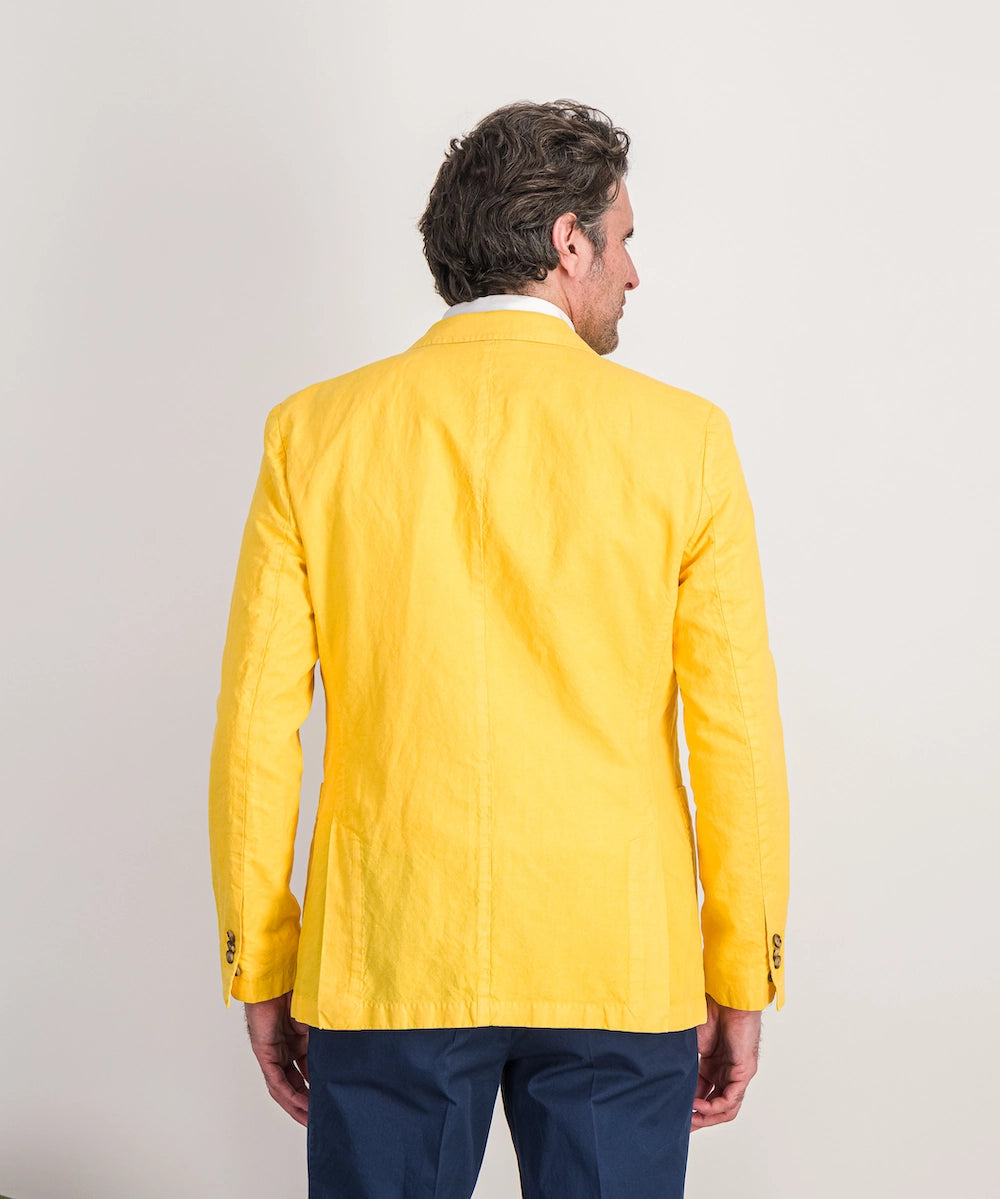 Modèle Positano. Veste non doublée, déstructurée de coupe classique. Composée de 51% lin, 49% coton (310)g. Tailles 52 au 54. Coloris : jaune.