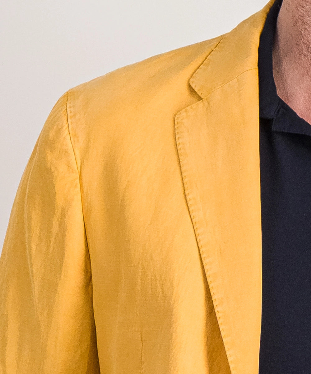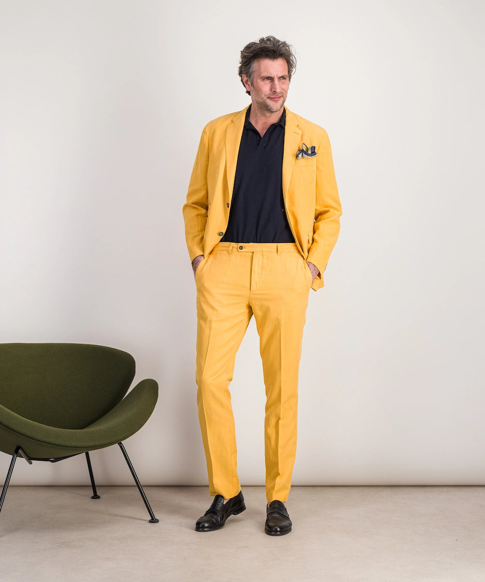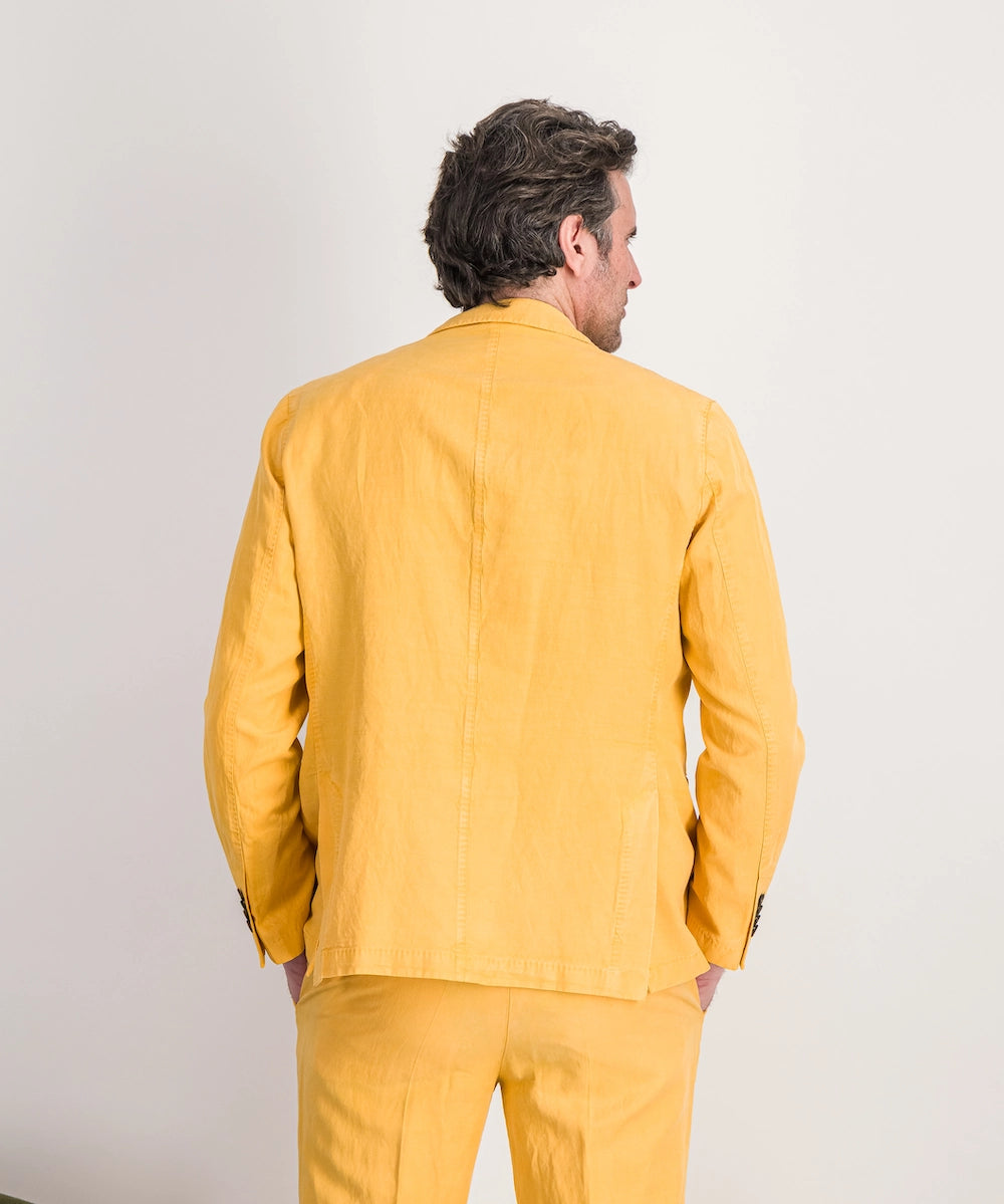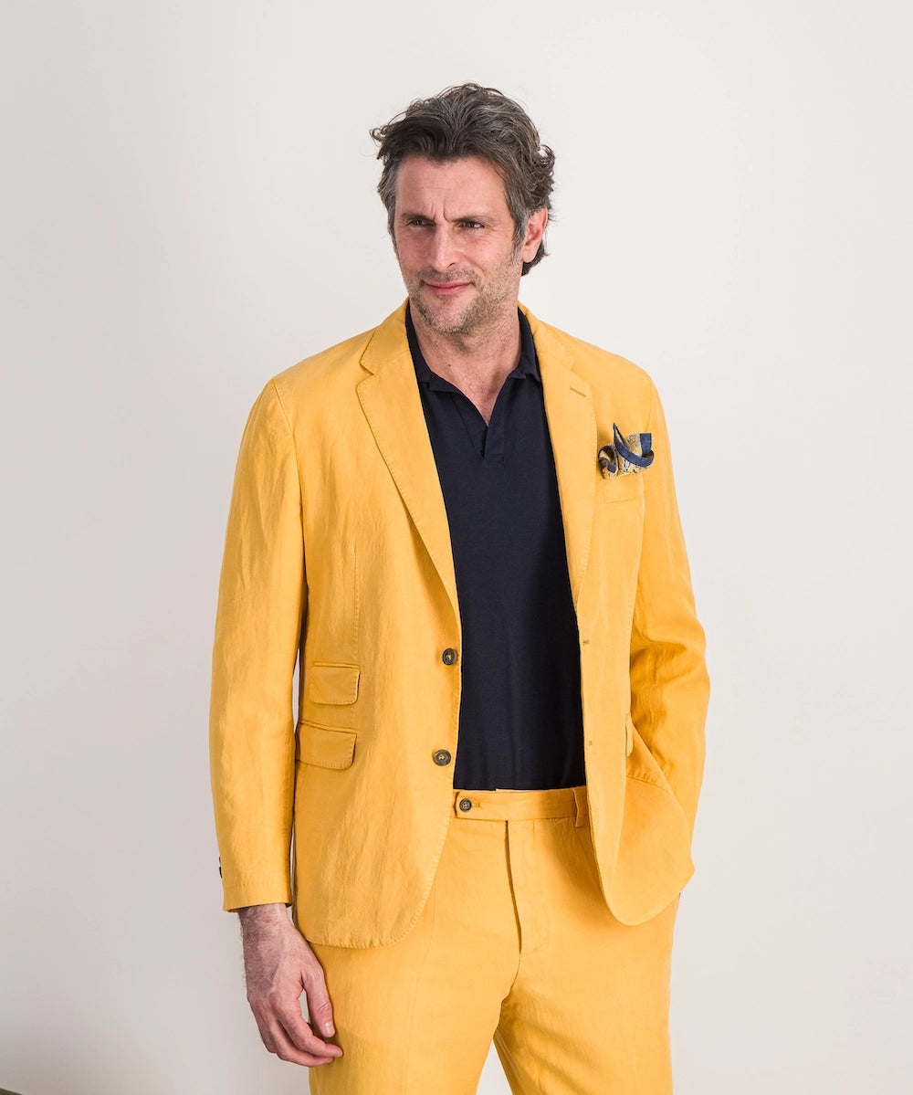 Veste Florentin. Veste destructurée classique et fluide. Compositon 59% lyocell, 23% lin, 18% coton. Tailles 52 au 56. Coloris : jaune.