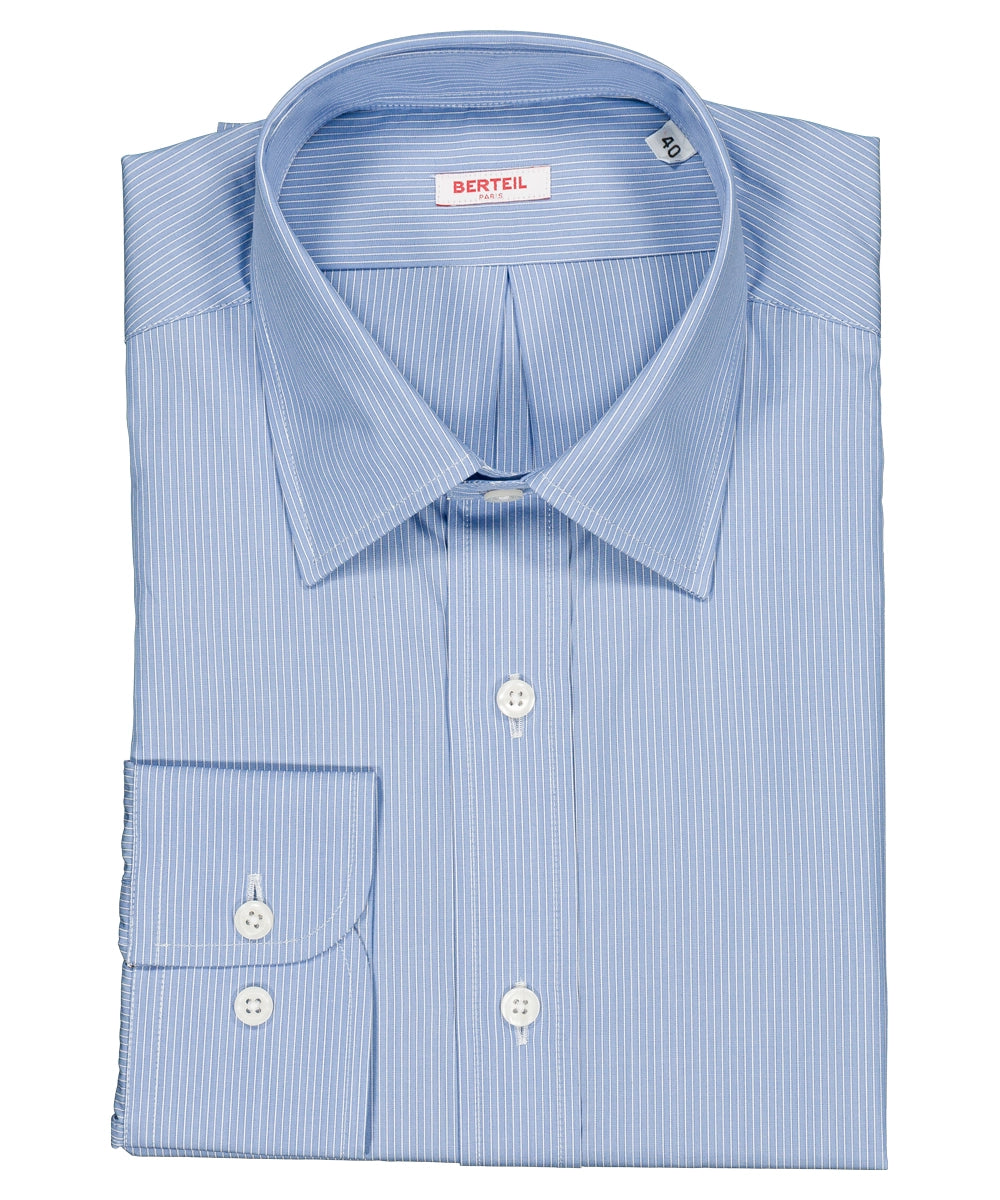 Chemise Alfred RV. Coupe classique à col ville avec des poignets simples. 100% coton. Existe en taille 38 à 44. Couleur : fine rayure bleue.