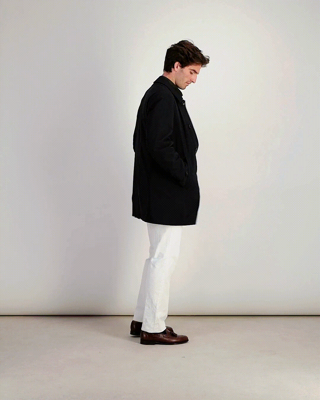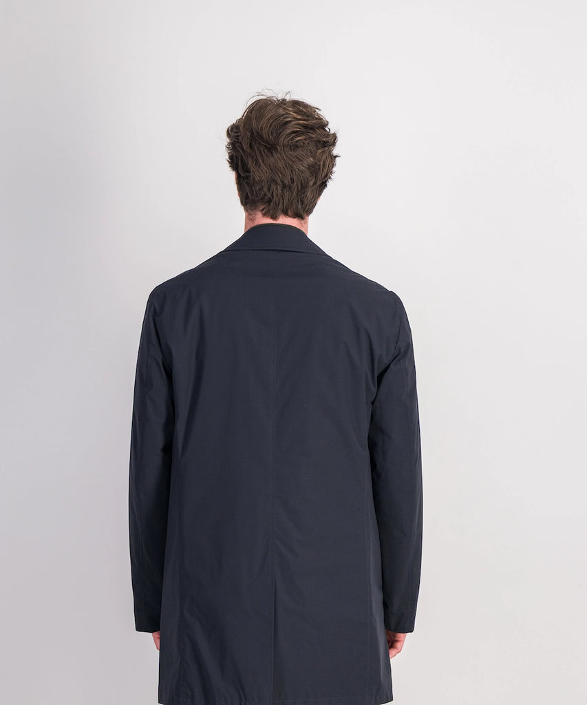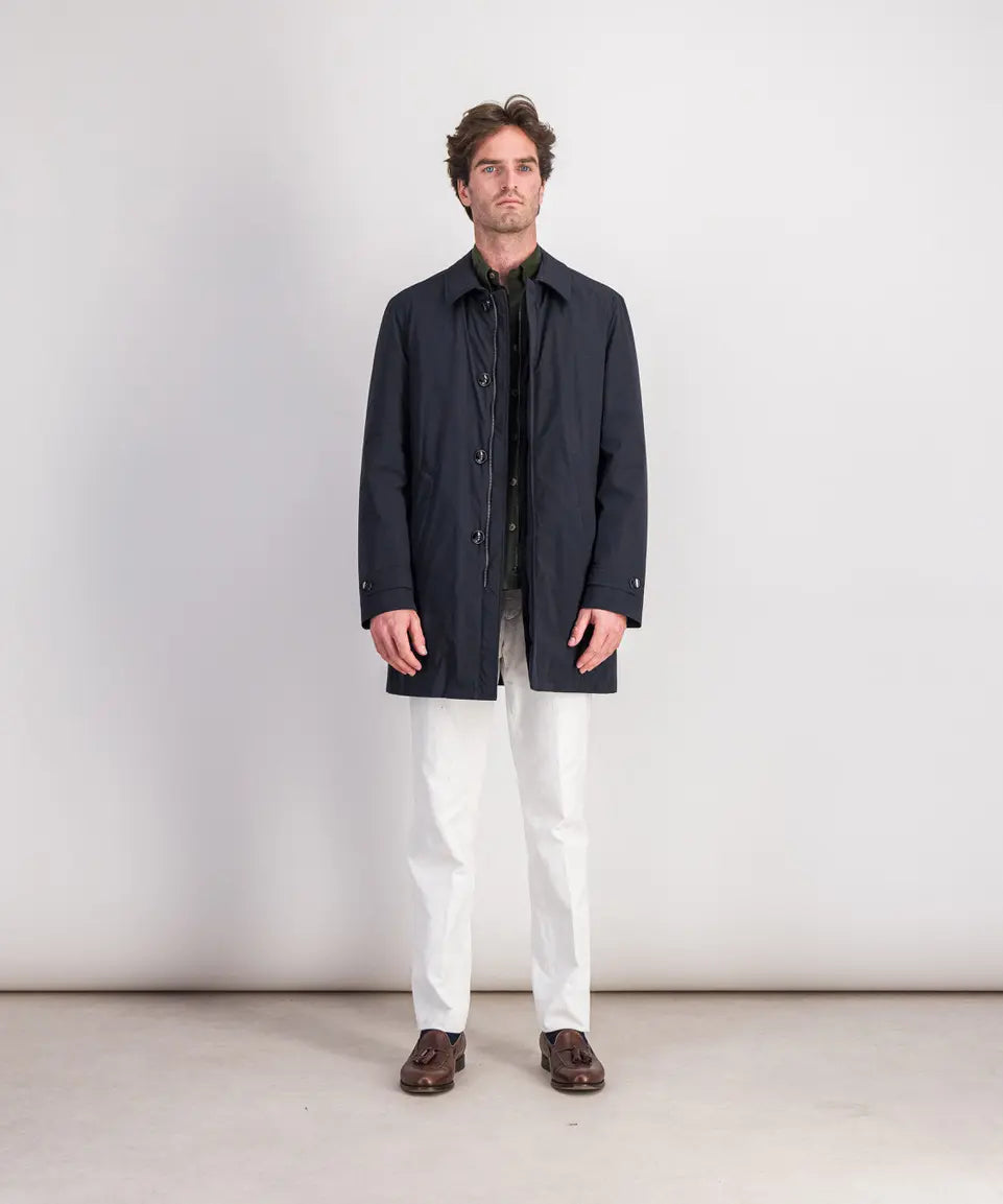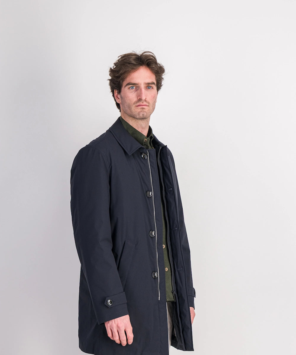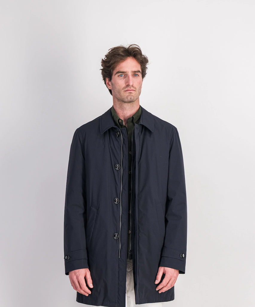 Modèle Maillol. Imperméable de ville court de coupe moderne avec un dourlage amovible. 100% polyester. Taille 50 au 58. Coloris : marine.