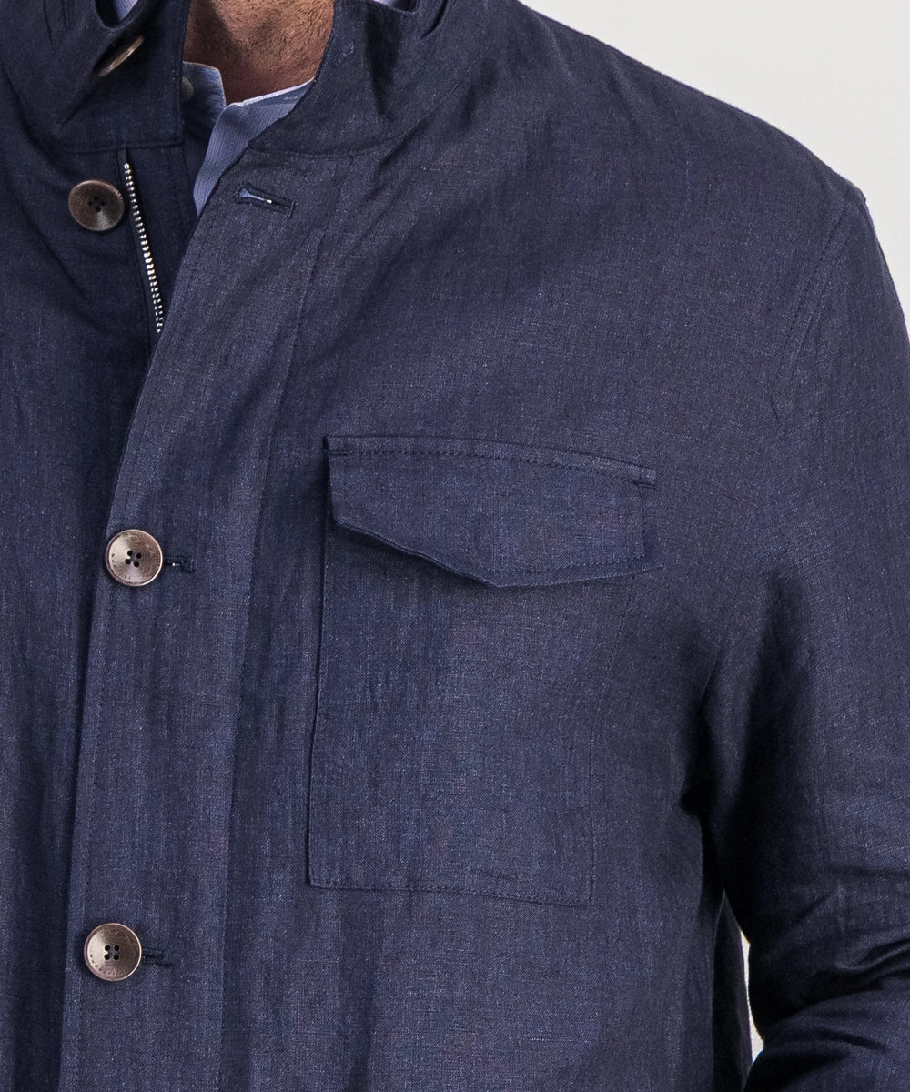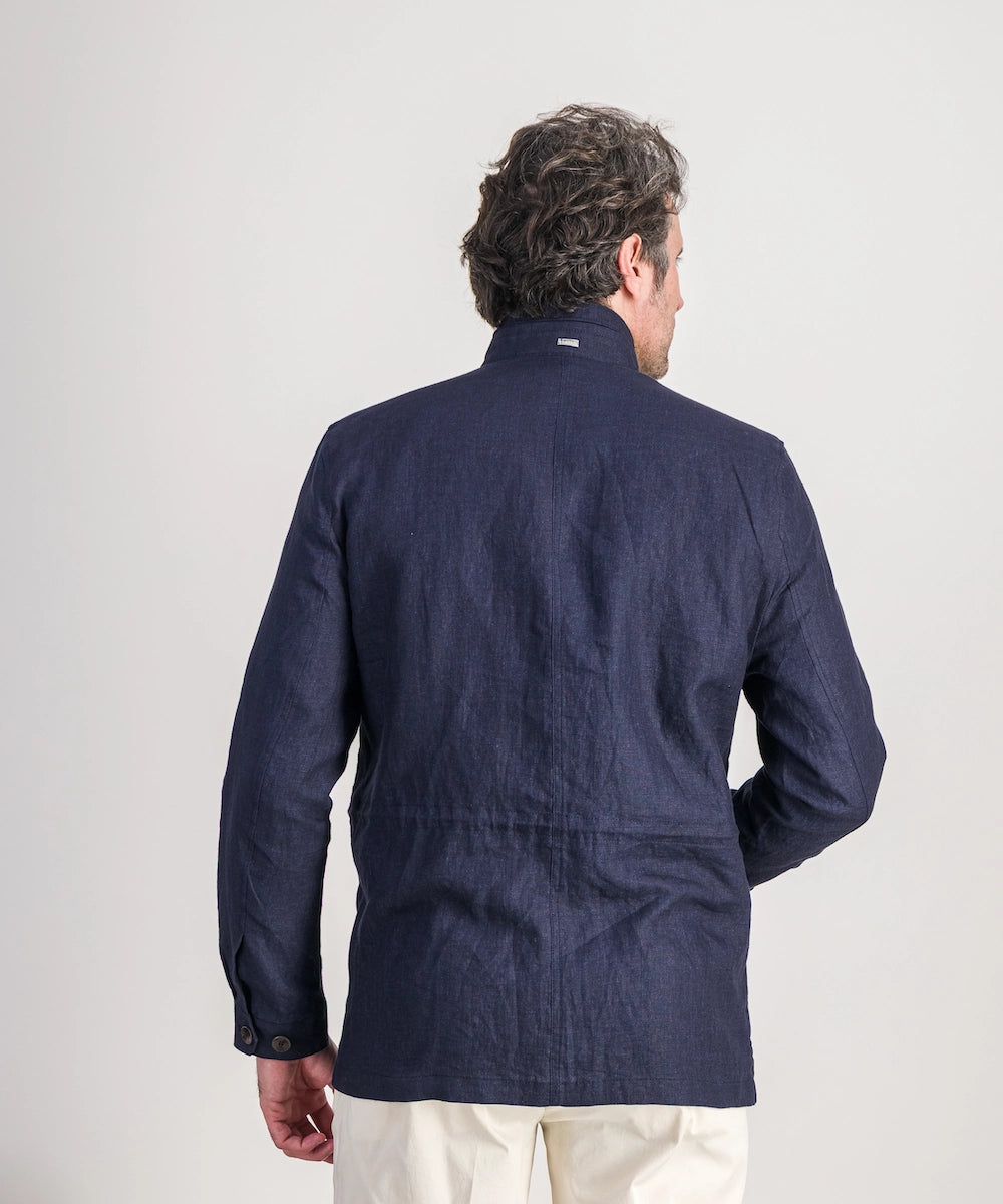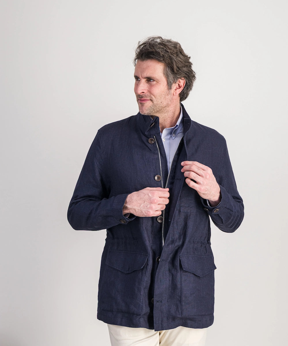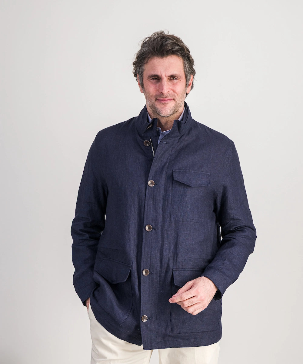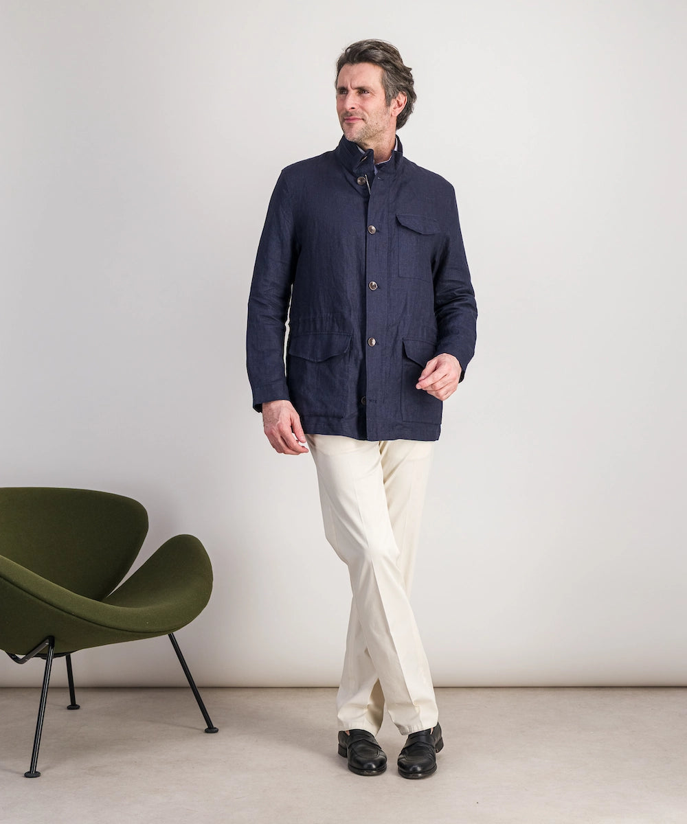 Modèle Tanger. Veste saharienne. 100% lin 170 g. Taille 50 au 58. Coloris : marine.