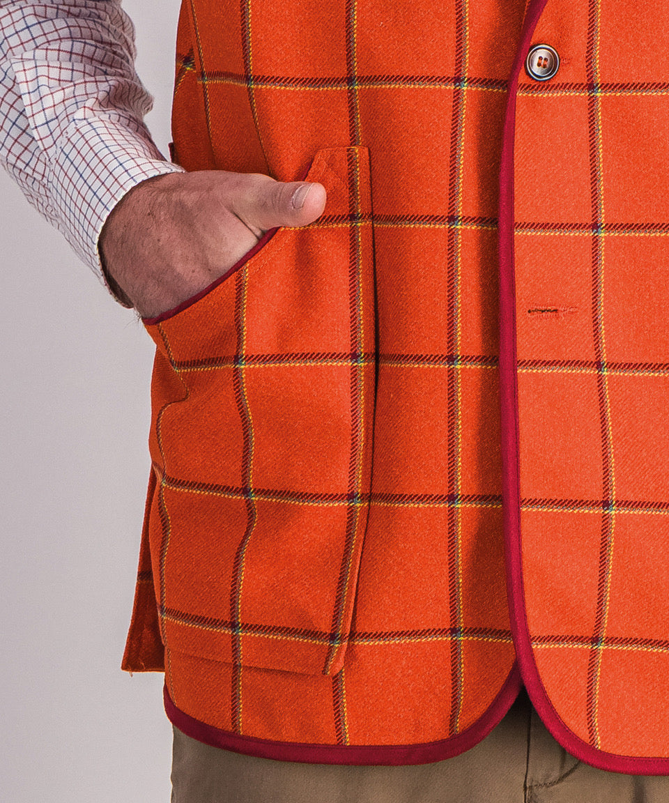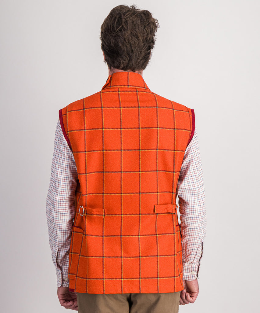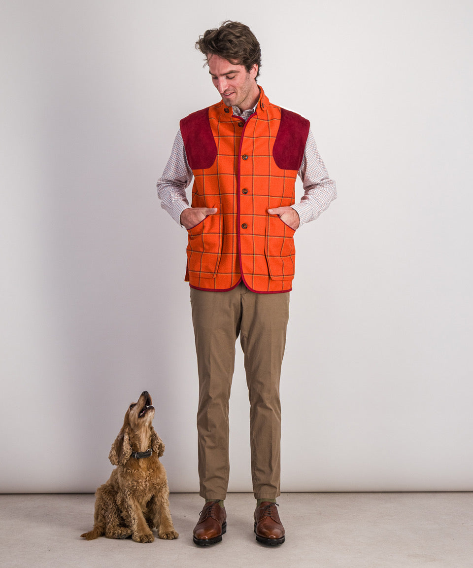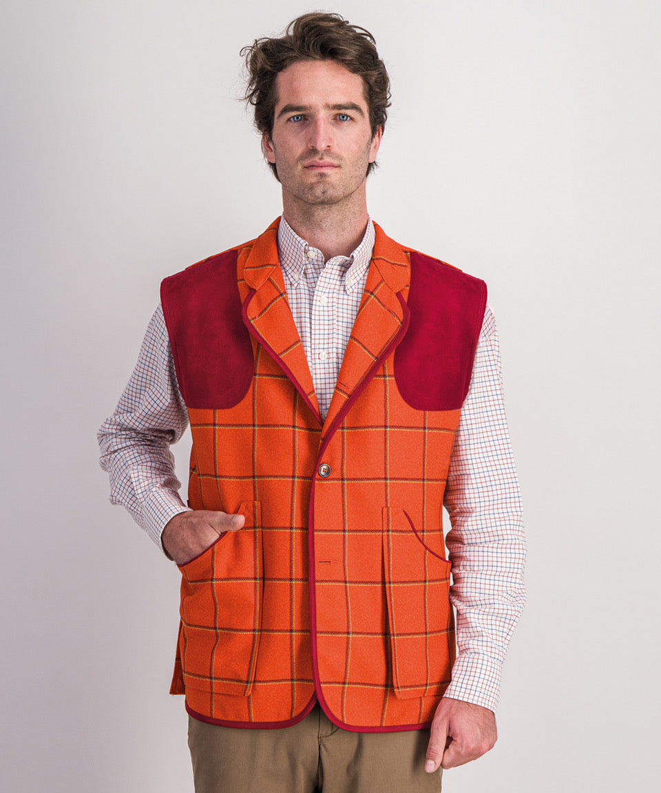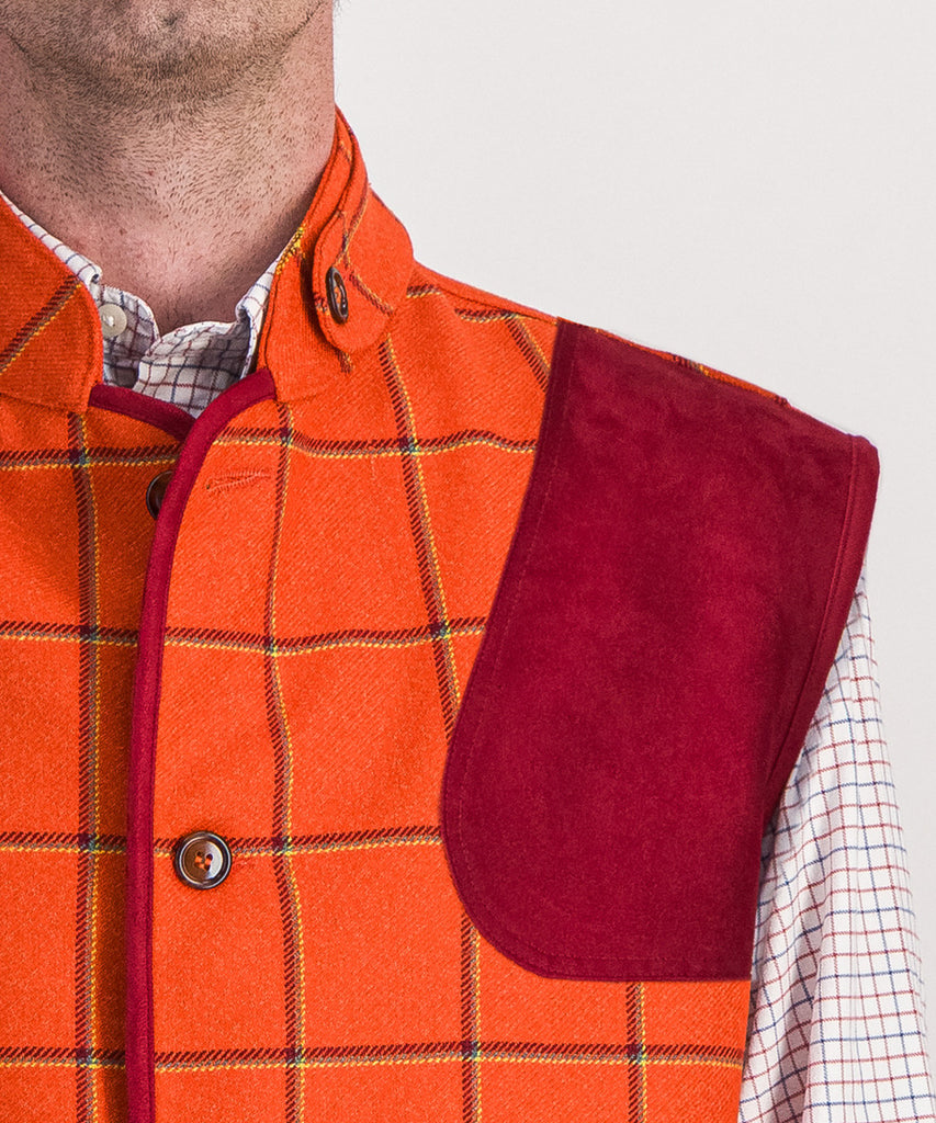 Modèle Berry. Veste sans manches en tweed conçue pour les chasseurs qui ne bradent pas l'élégance au motif de la sécurité. La veste se caractérise par deux grandes épaulières en suédine, un col officier avec trois boutons (pour le garder ouvert, fermé ou rabattu comme une veste de tailleur), deux larges poches basses de battue et deux pattes de serrage. Elle est confectionnée dans un tweed en provenance d'Ecosse et est fabriquée à Paris ! Composée de 95% laine et 5% suédine. Disponible du 44 au 62.