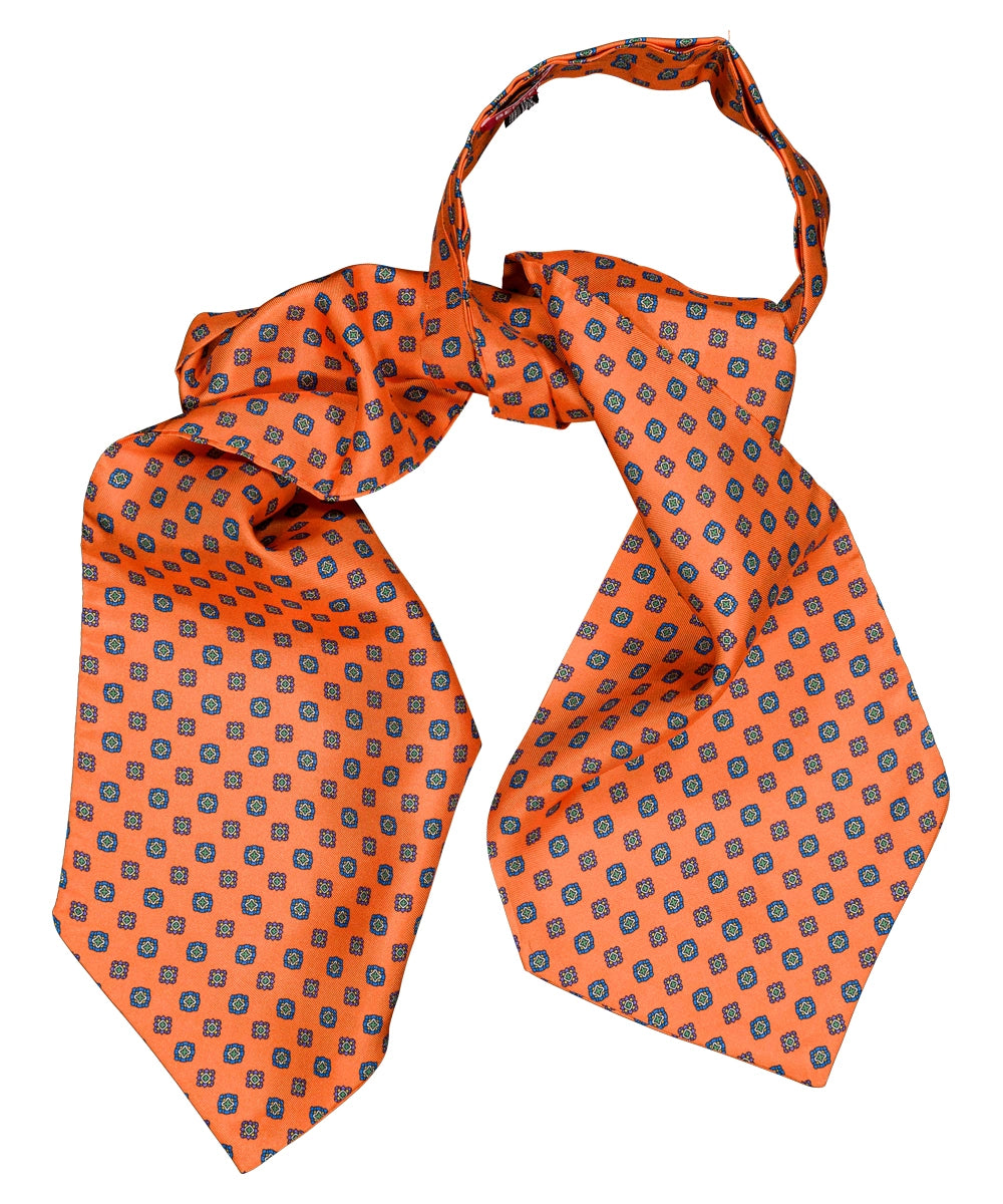 Modèle Ascott. Il donne un chic fou à une tenue simple ou habillée. 100% soie. Coloris : motifs multicolore sur fond orange vif.