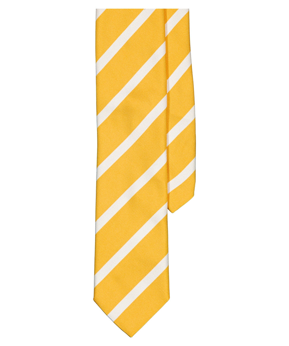 Modèle pise. Cravate en soie et en coton. Composée de 60% soie et 40% coton. Motif : rayure blanc sur fond soleil.