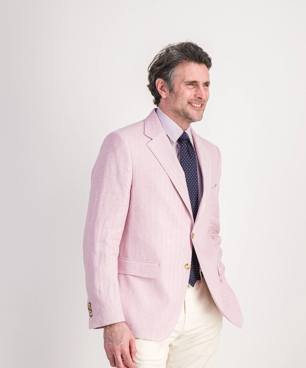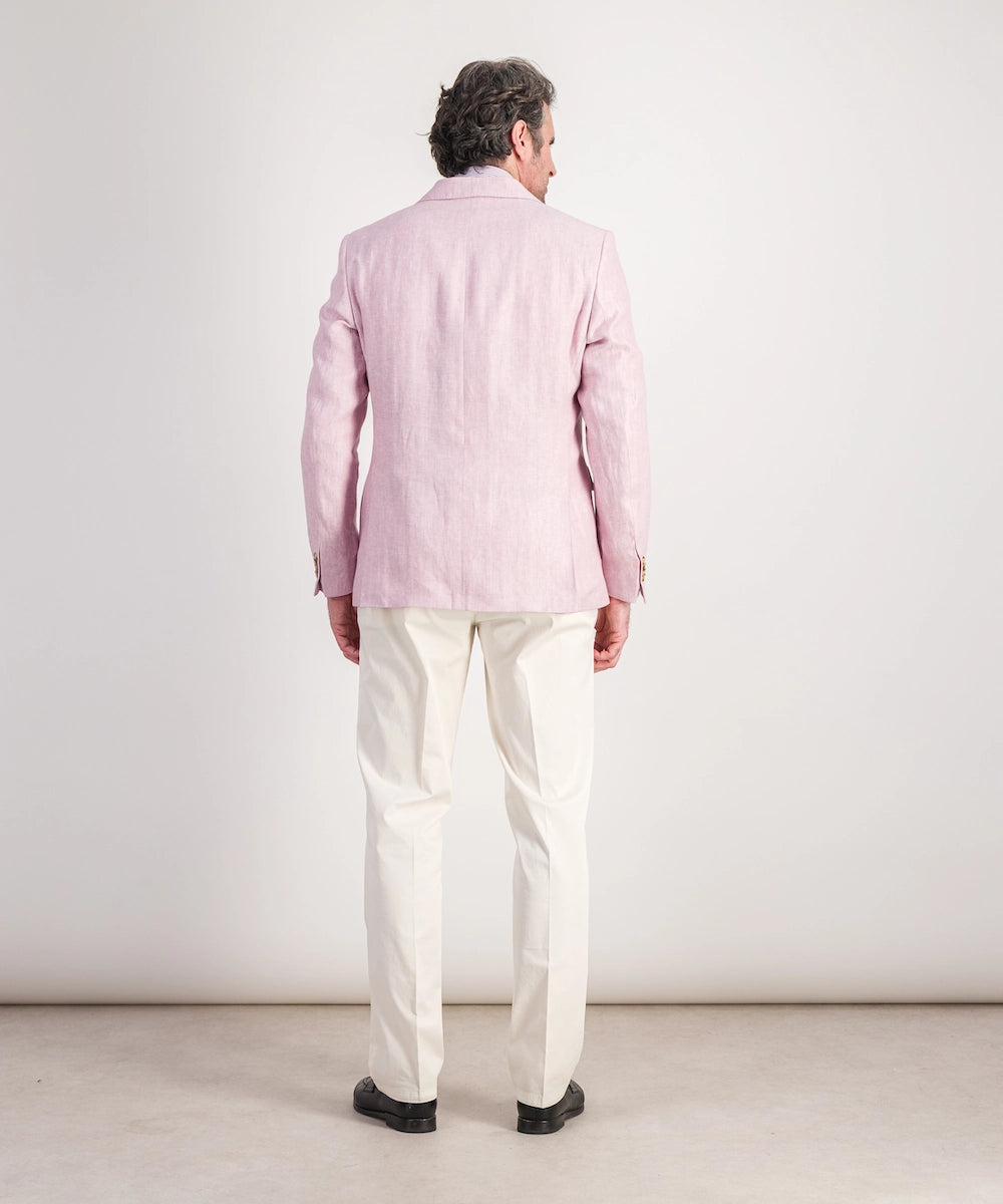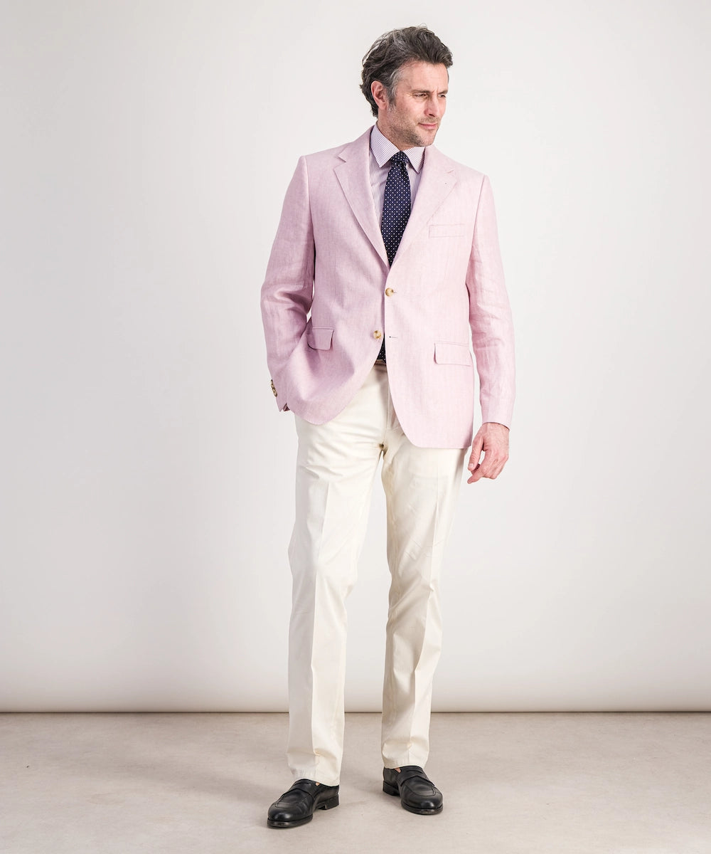Modèle Killarney L. Veste demi-doublée de coupe classique. Composée de 100% lin 200g. Taille du 50 au 54. Motif : chevron rose pastel.