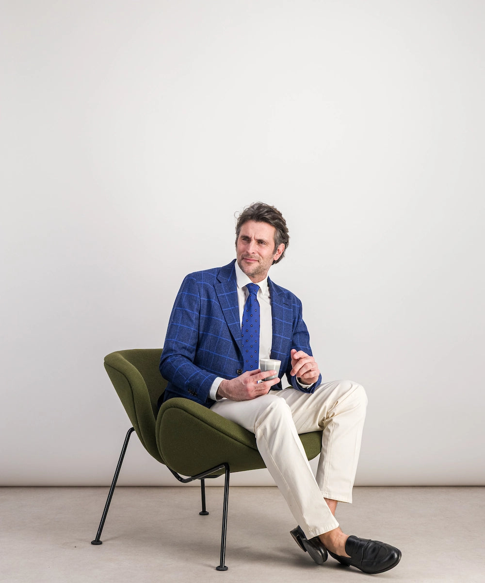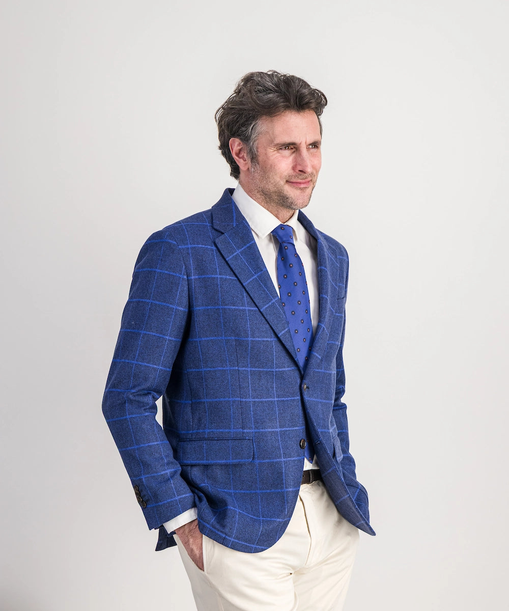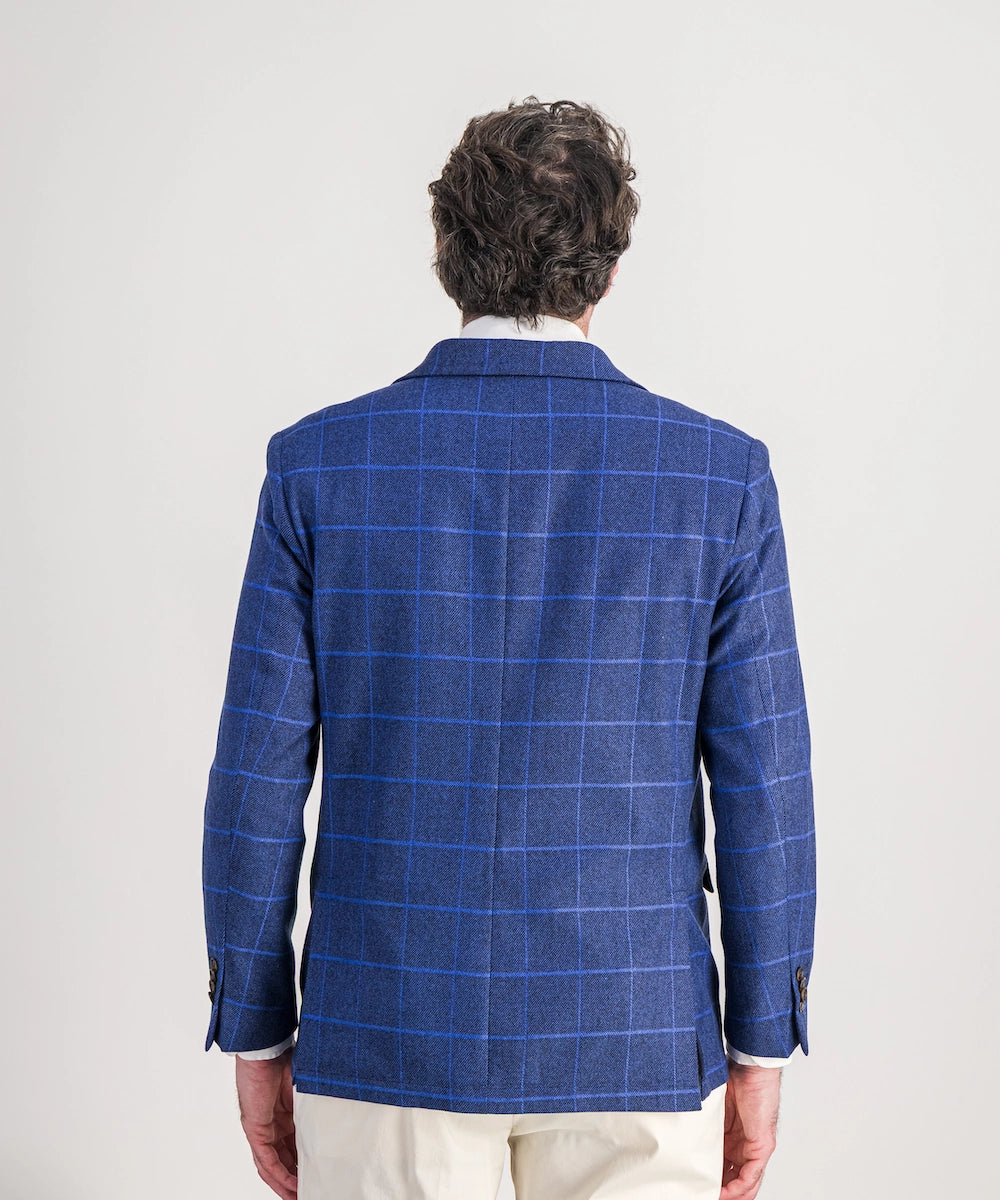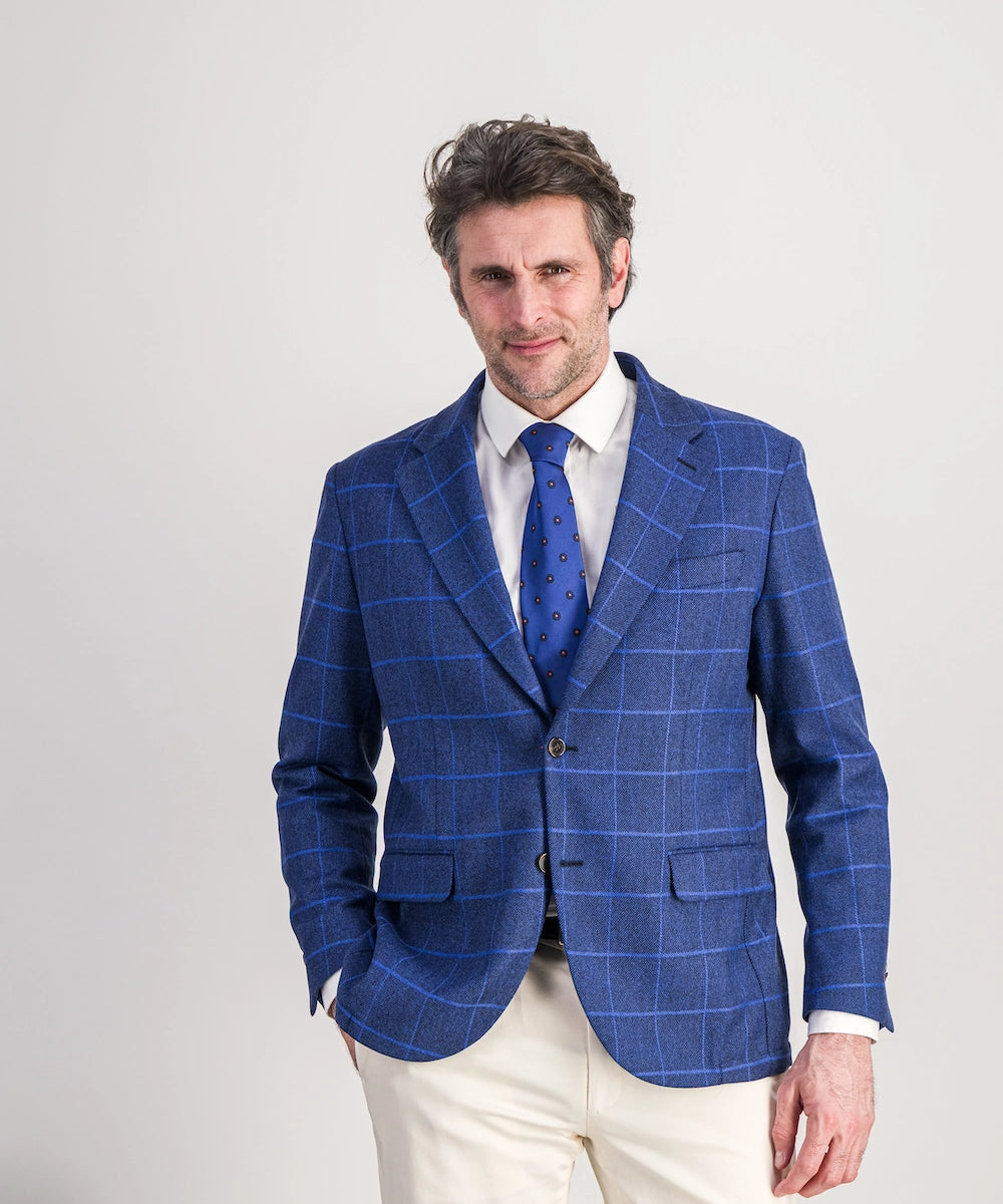 Modèle Orus. Veste destructurée demi-doublée de coupe moderne. Composition 86% laine, 14% polyamide. Tailles disponibles du 50 au 58. Coloris : carreau bleu roy.