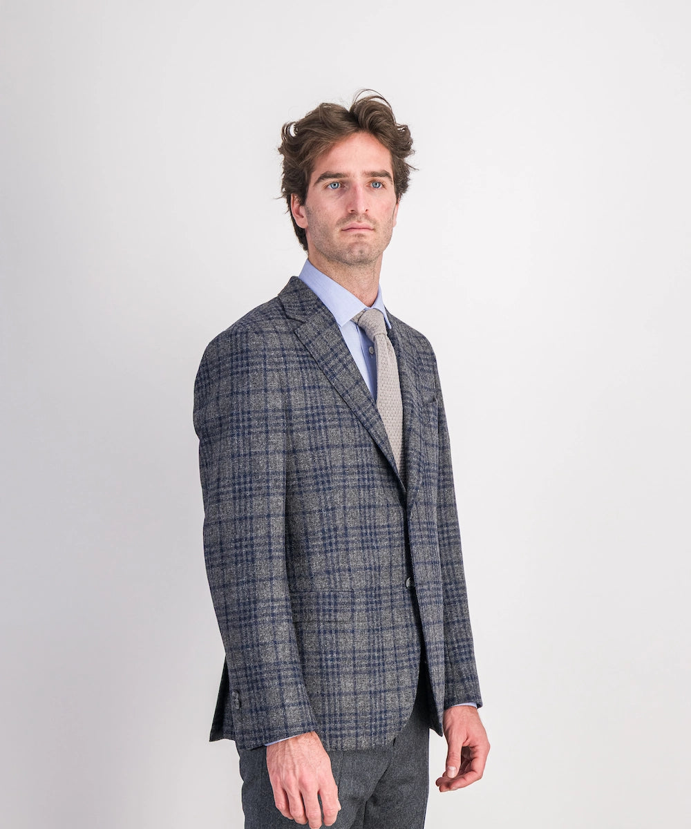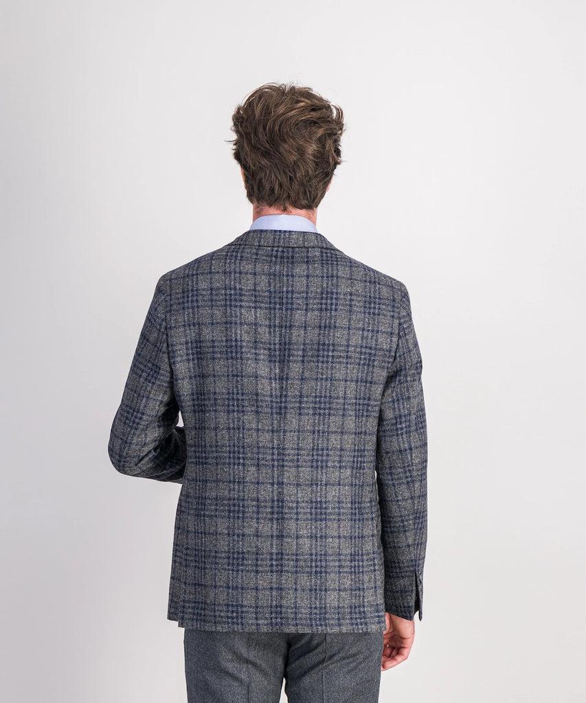 Modèle Prusse. Veste destructurée demi-doublée avec des poches à rabat. Composée de 100% laine 320 g. Tailles du 52 au 58. Motif : careaux bleu gris.