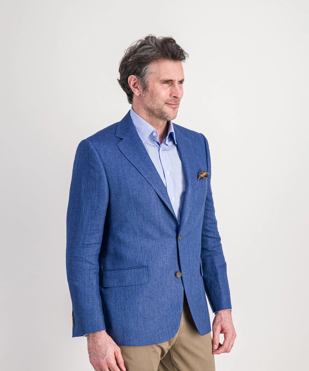 Modèle Quadrille. Veste demi-doublée de coupe traditionnelle. 100% lin (295g). Tailles 50 au 60. Coloris : chevron bleu.