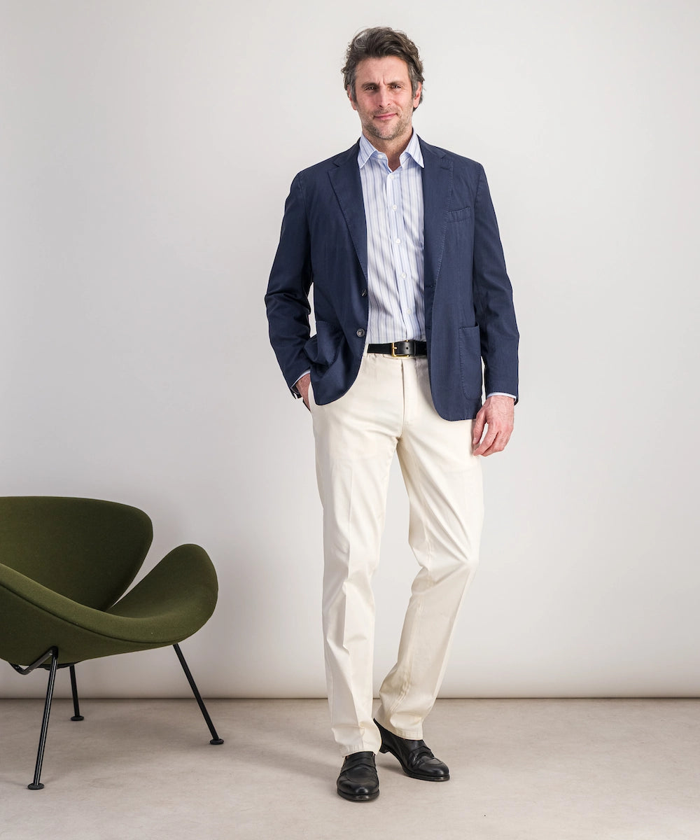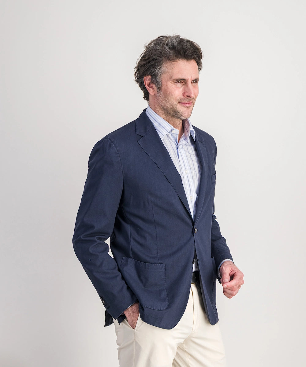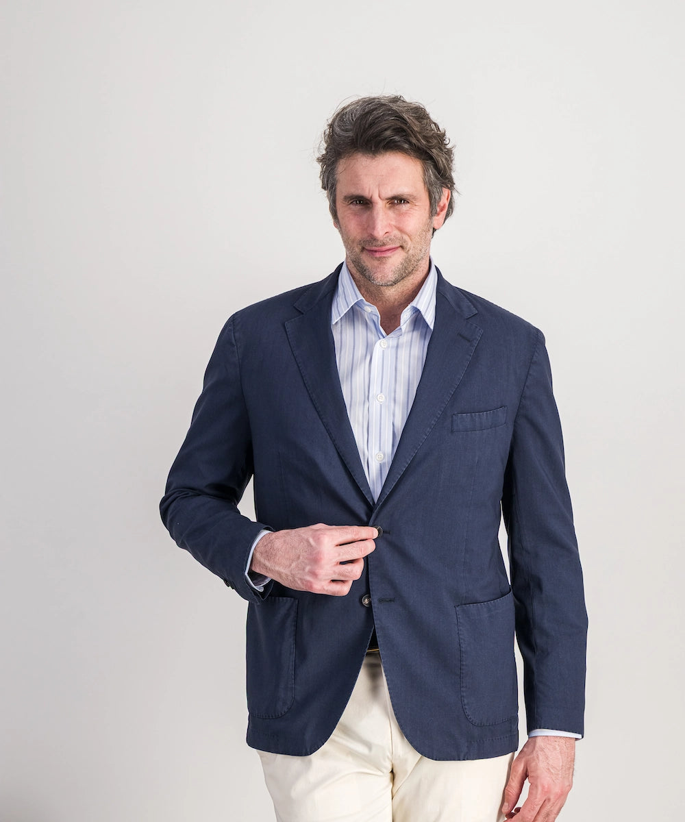 Modèle Toscan L. Veste déstructurée non-doublée en laine légère. Composée de 100% laine superfine 200g. Tailles du 50 au 58. Coloris : marine.