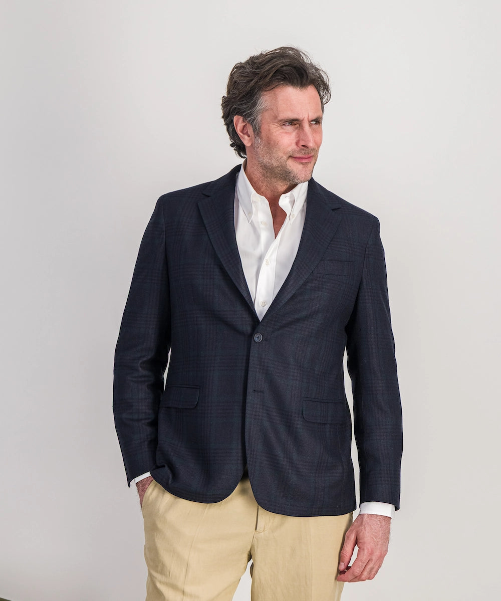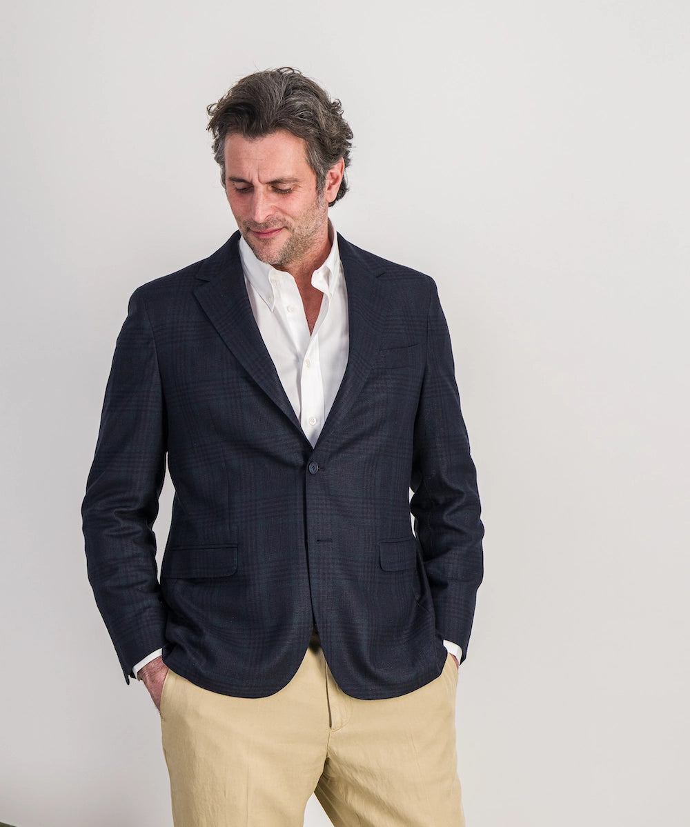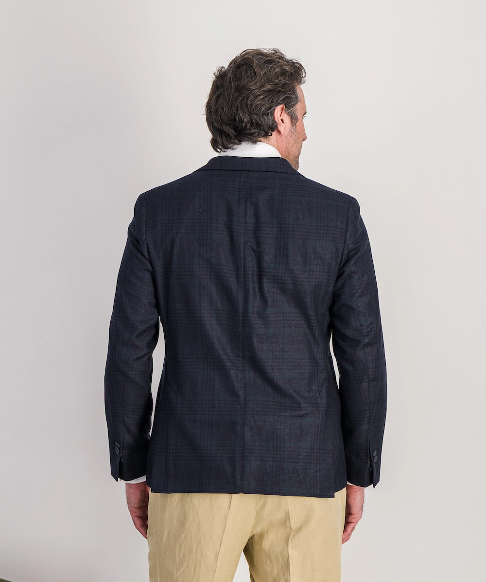 Modèle Prusse. Veste destructurée demi-doublée avec des poches à rabat. Composée de 100% soie. Tailles du 50 au 60. Motif : tartan noir, vert, marine.