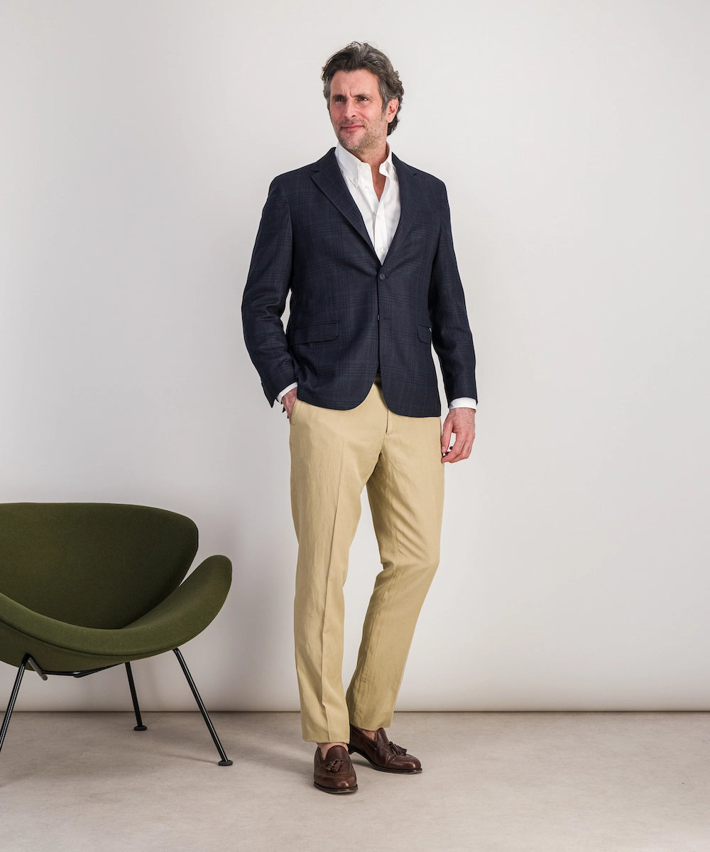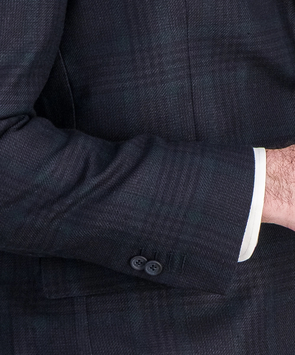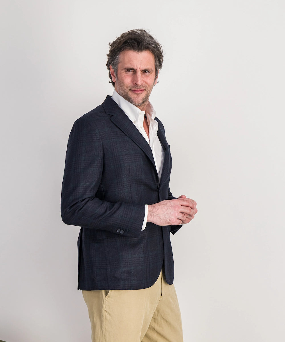 Modèle Prusse. Veste destructurée demi-doublée avec des poches à rabat. Composée de 100% soie. Tailles du 50 au 60. Motif : tartan noir, vert, marine.