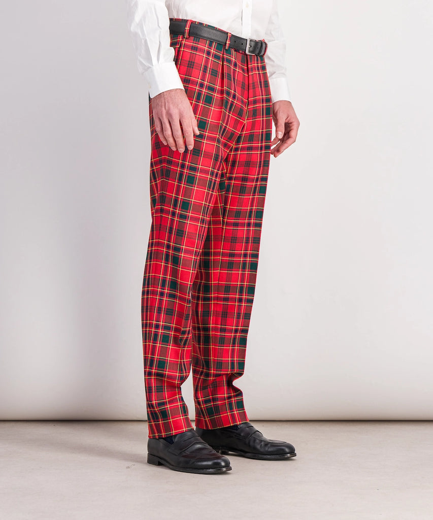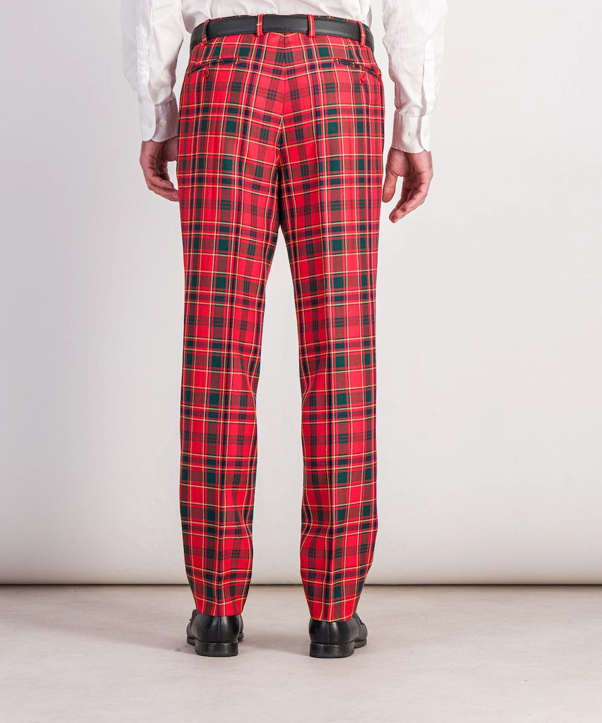 Modèle Golf Premium. Pantalon décontracté de coupe moderne avec pinces en laine à carreaux. 100% laine 310 g fabriquée en Angleterre. Taille du 44 au 48. Tissu Dugdale Ecossais rouge.